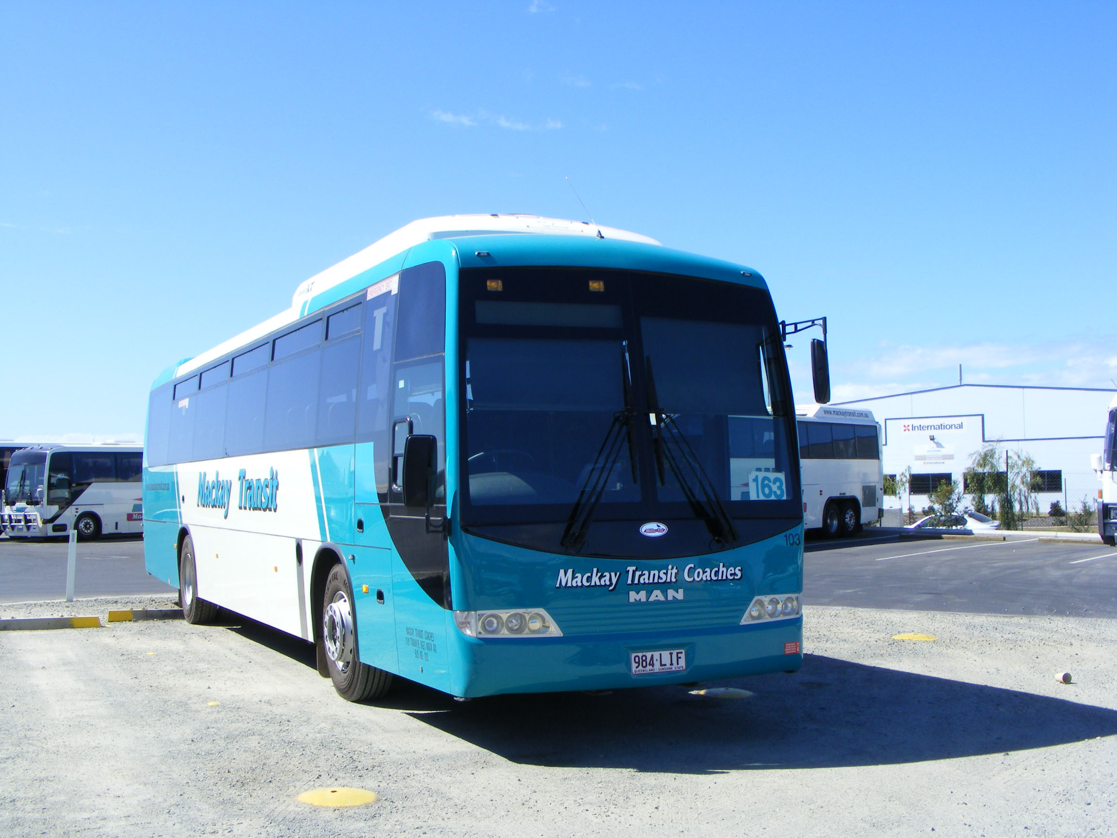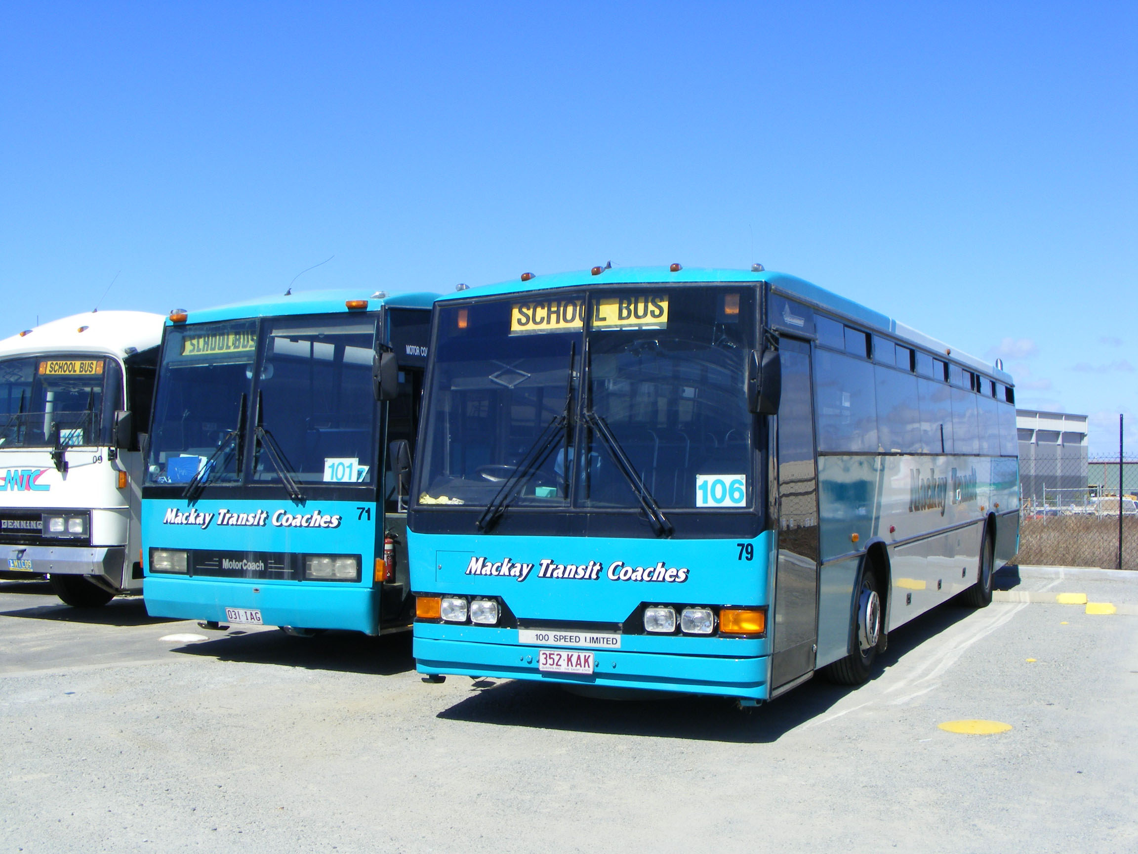 An interesting pair of vehicles, still in the fleet in 2014. On the left we have 71 (031IAG) a 1993 bus seated Isuzu LT11-1P with MCA body new to Great Lake Coaches in New South Wales but acquired from the King Bros Group in Kempsey. On the right is 79 (352KAK) a newer (1996) MAN 16.240 also with 61 bus seats, but this time with bodywork by NCBC. |