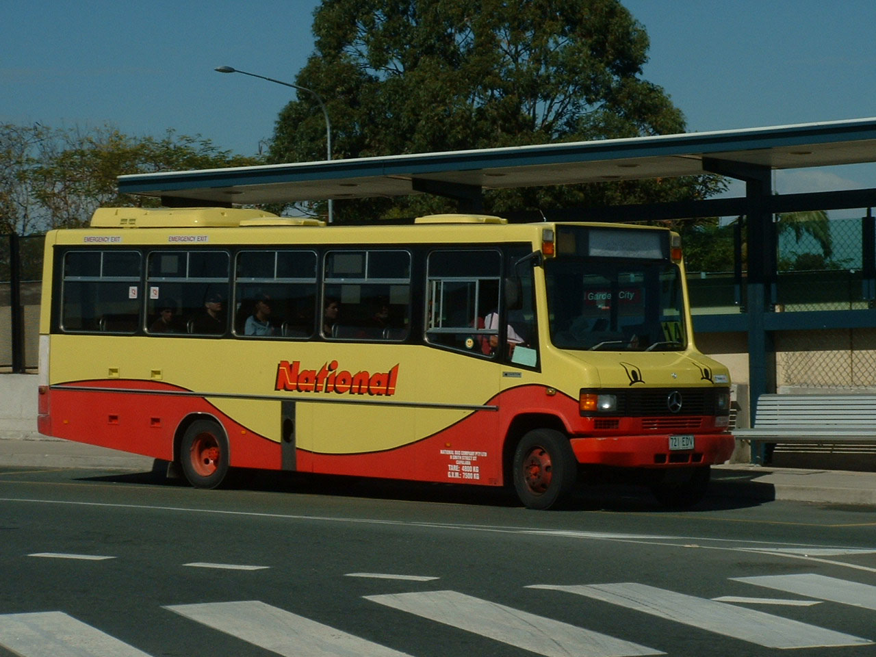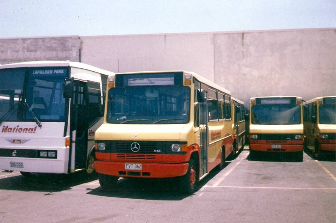 Several Mercedes LO812 with 26 seat single door Custom bodies are seen in a shot with a white Hino. The Mercedes appear recent arrivals from National Bus in Victoria as the bus nearest the camera still has its Victoria rego plate, FVT062, where it was fleet number 402. It was given rego 733EHG with National in Queensland.