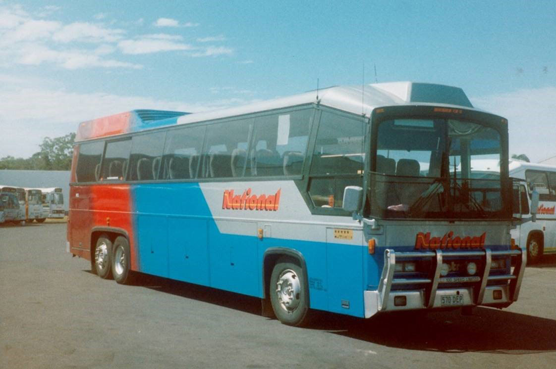 National had an interersting multicoloured coach livery as on thie Austral Tourmaster DC122, 570DEP. The coach originated in Victoria with the ill-fated Deluxe Coachlines based at Wangaratta. The coach came to National by way of Bayside Bus Lines and Sundowner Scenic Tours, both in Queensland.
