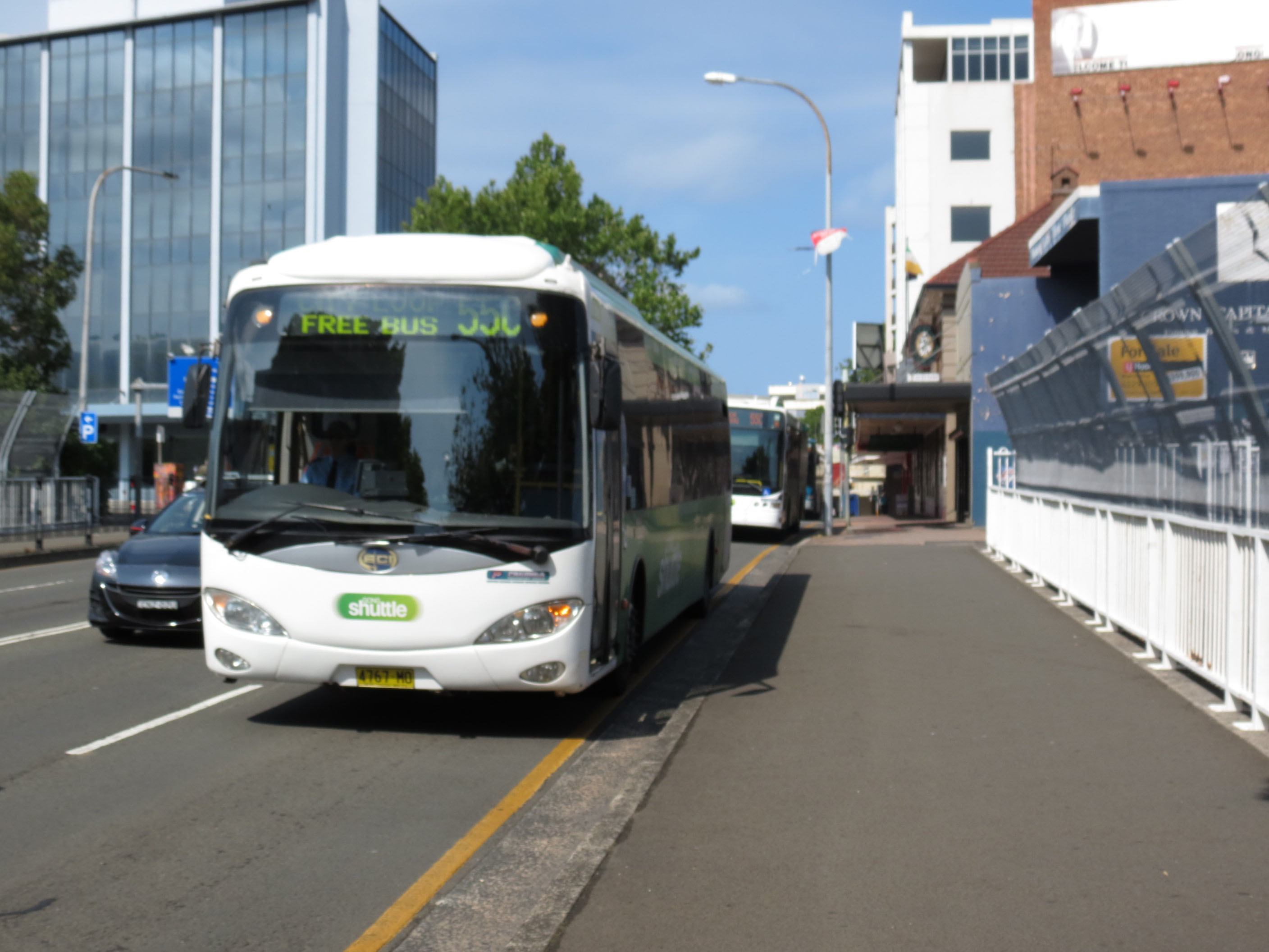 In common with other NSW cities Wollongong had a free shuttle service operated by buses in white and green. It became known as the "Gong Shuttle", operated here by PK6120AG 4767MO. Unlike other city shuttles, the "Gong Shuttle" was still going strong over ten years later, though the BCI buses had given way to buses in TfNSW livery.