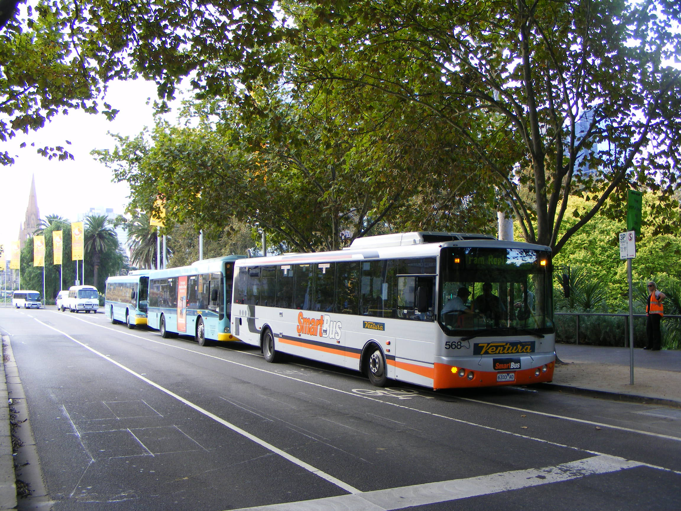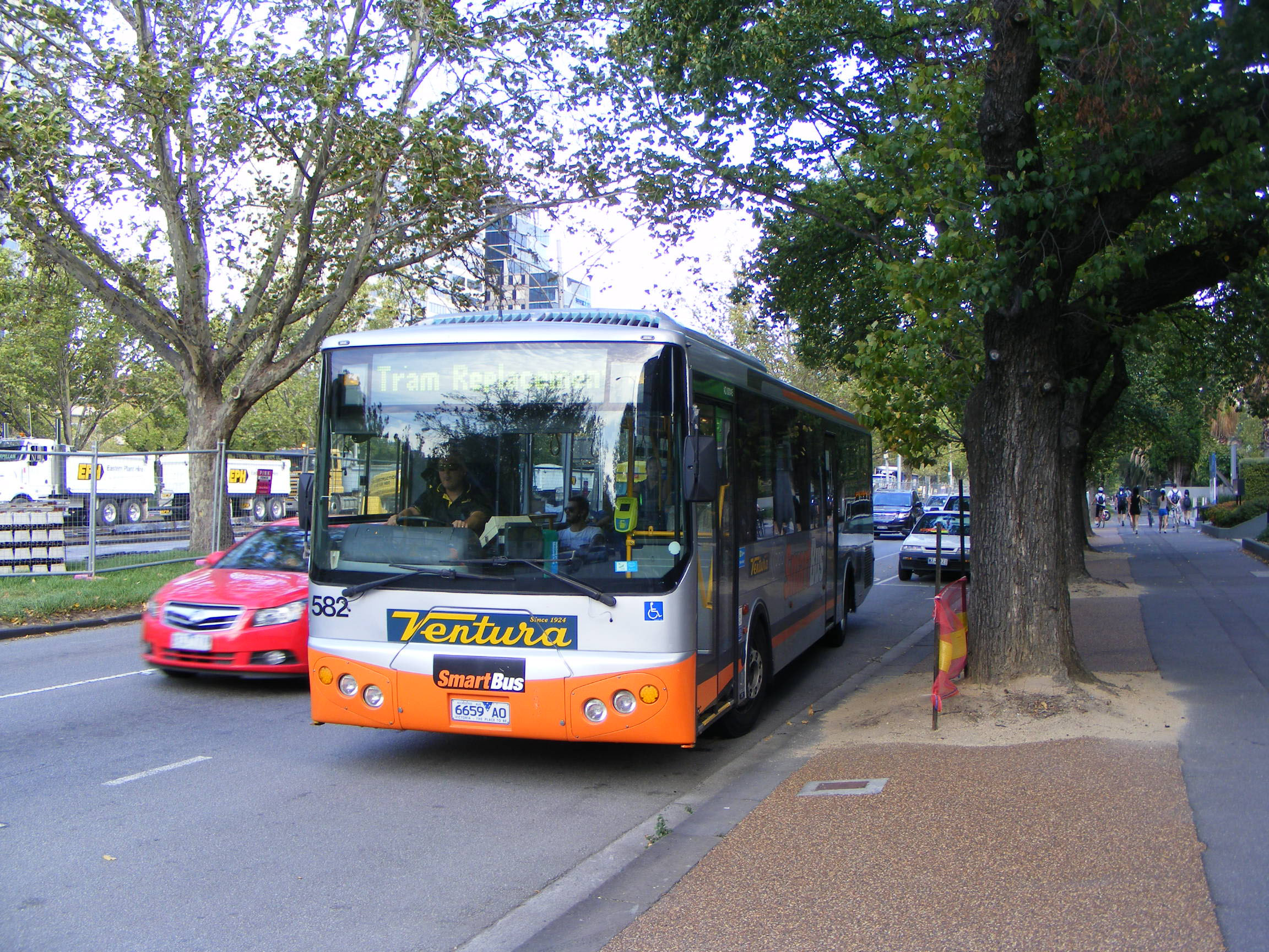 All hands to the pumps over Easter 2012 when a large section of the trunk tram line on St Kilda Road was relaid over the weekend. Ventura arranged the tram replacement bus service employing a wide range of vehicles both hired in and from its own fleet. Here MAN 16.220 Designline SmartBus 582 (6659AO) is hard at work.