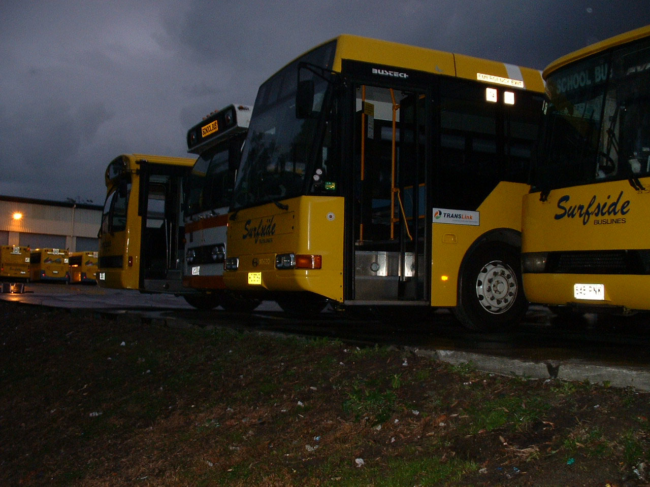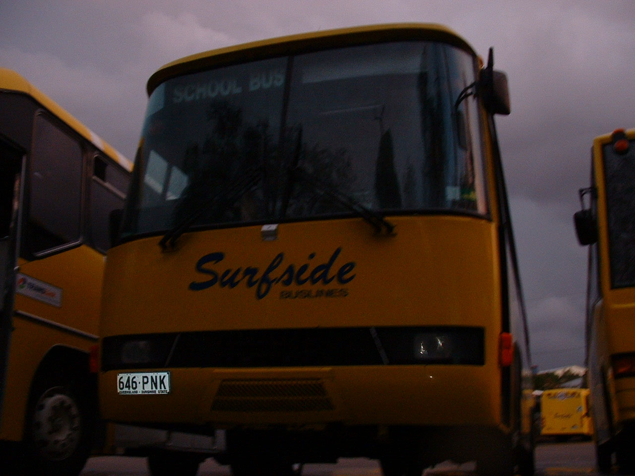 This bus is certainly not all that it seems: 643 (643PMG) is one of three former Japanese Volvo B10MLs bought for the Tokyo Expo in 1985. Most of the hundred machines ended up in Australia after the event. Surfside's trio however have lost the rear sections of their Fuji bodies and now masquerade as 53 dual door rigids. |