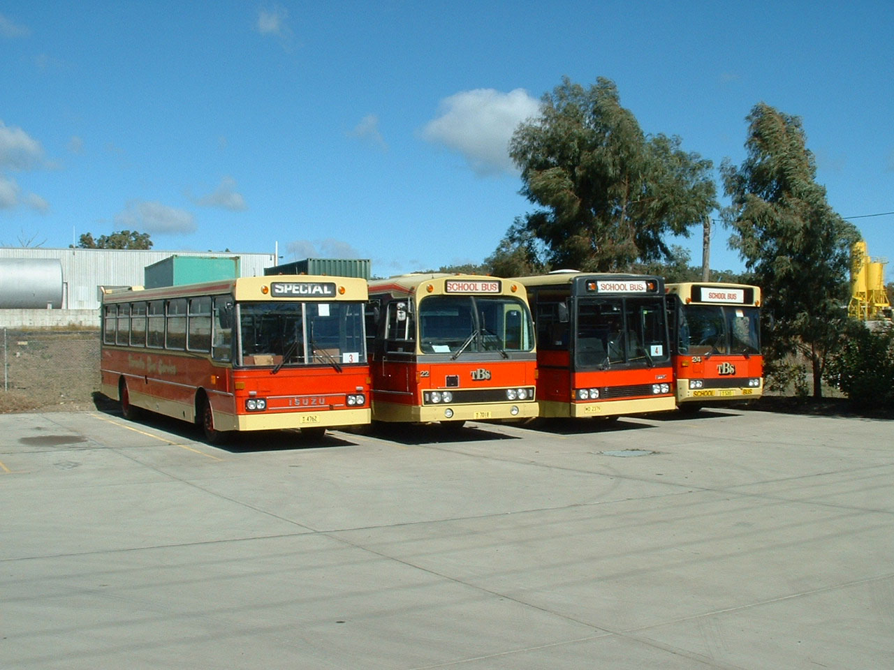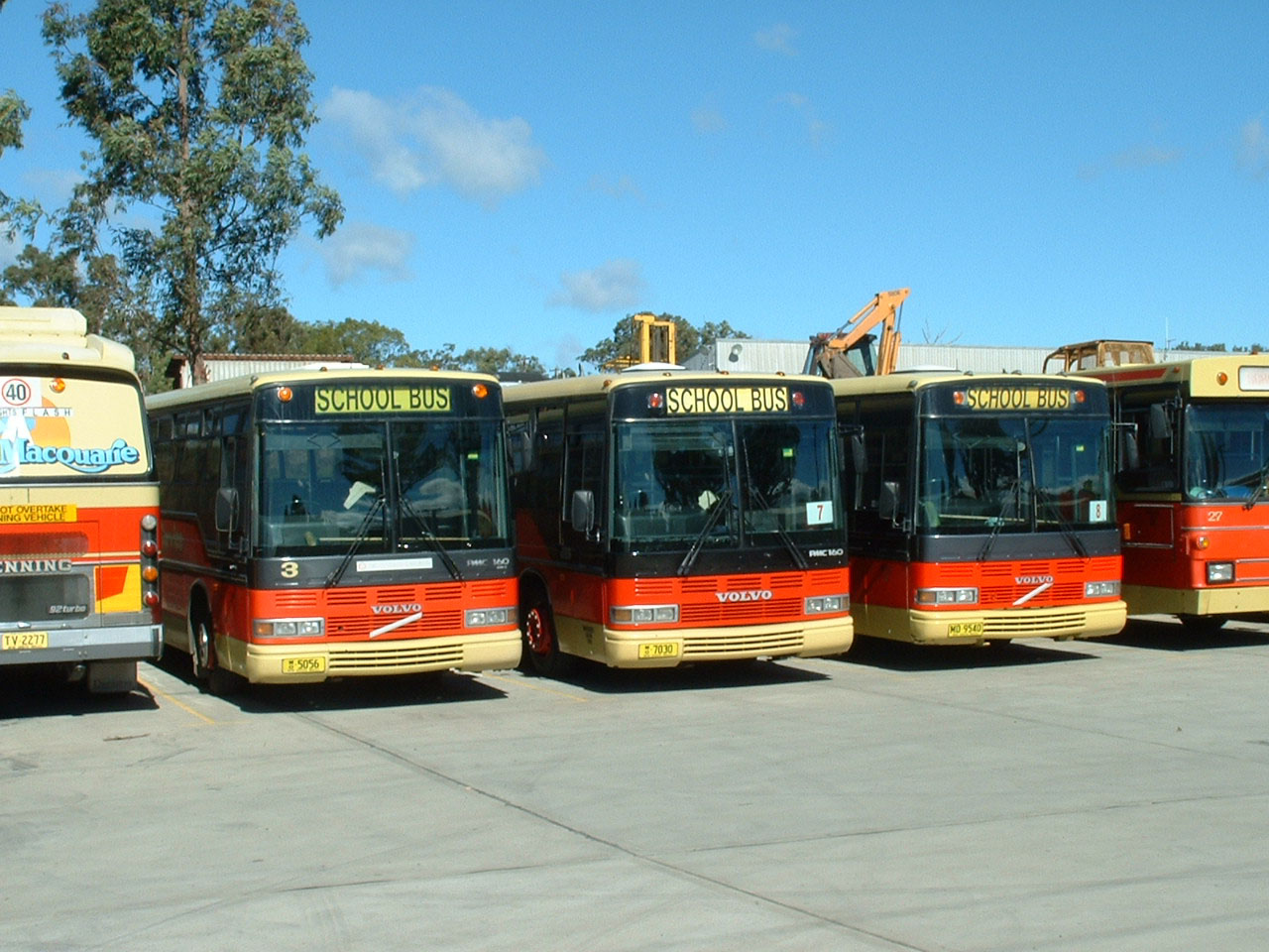 In contrast to the diversity above, nearby in the depot yard was this line up of three almost identical Volvo B10Ms with PMC 160 bus bodies. From the left are: 3 (MO5056) a 53 seat bus from 1993, 16 (MO7030) a 61 seat bus from 1991 and 26 (MO9540) a 53 seat dual purpose machine from 1993. Note the back of fleet number 1 (TV2277) a 1984 Denning coach. |