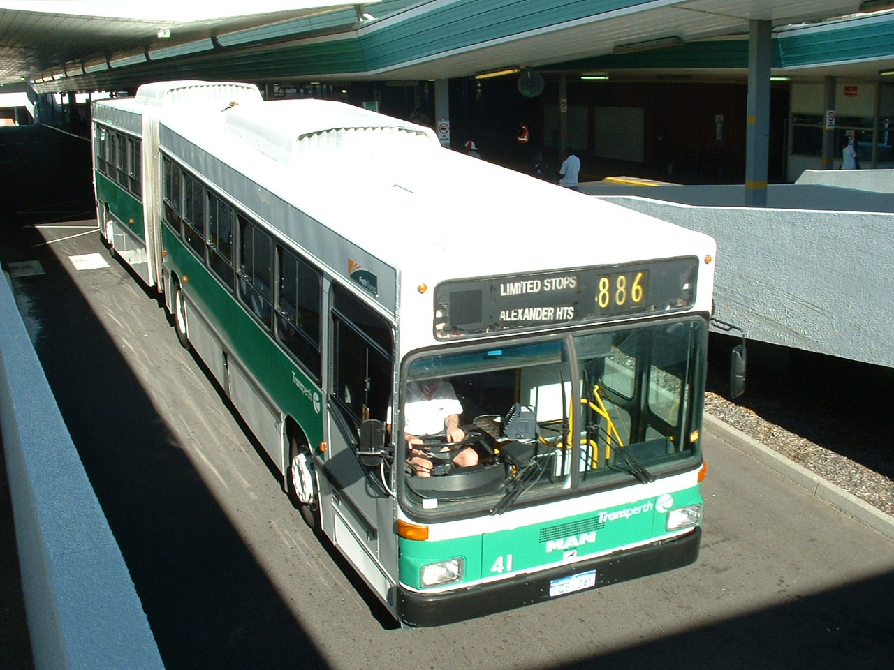 Mercedes O305G/Porter 475 (UQB475) is seen in April 2003 on St George's Terrace. The bus is some ten years older than the small batch of MAN artics.