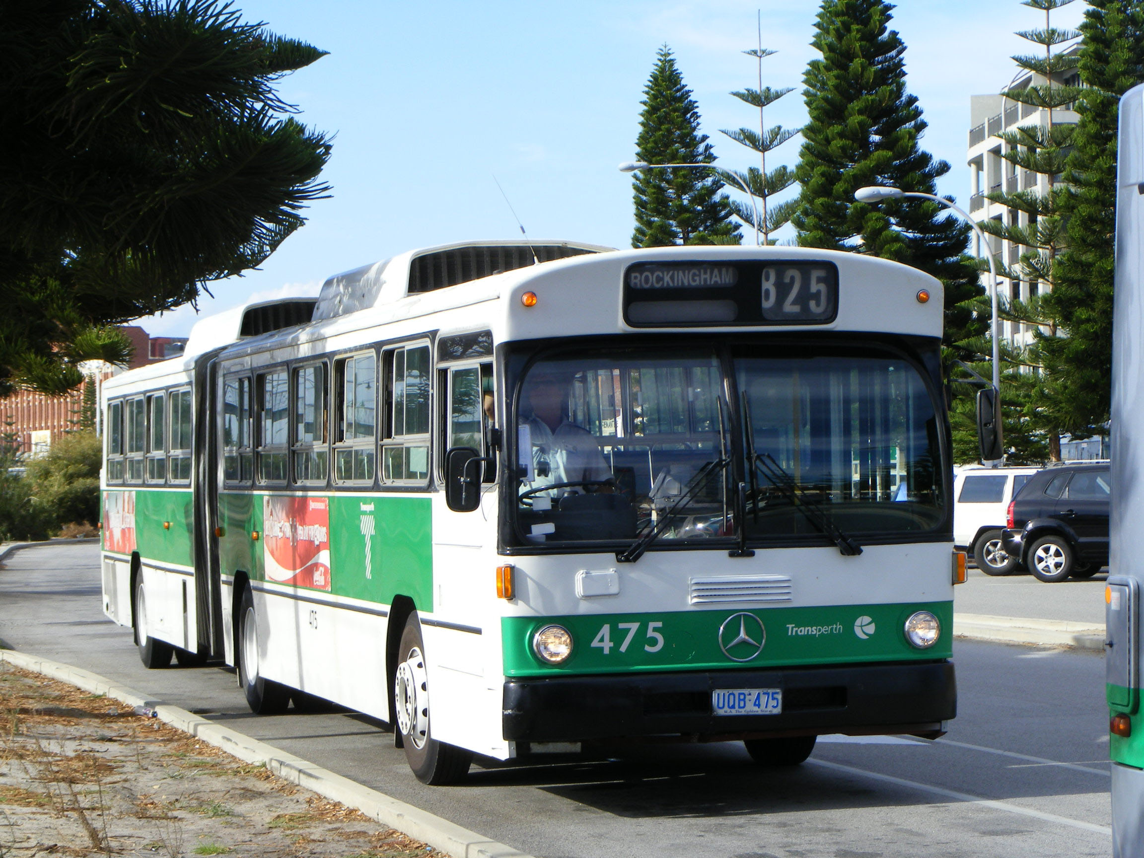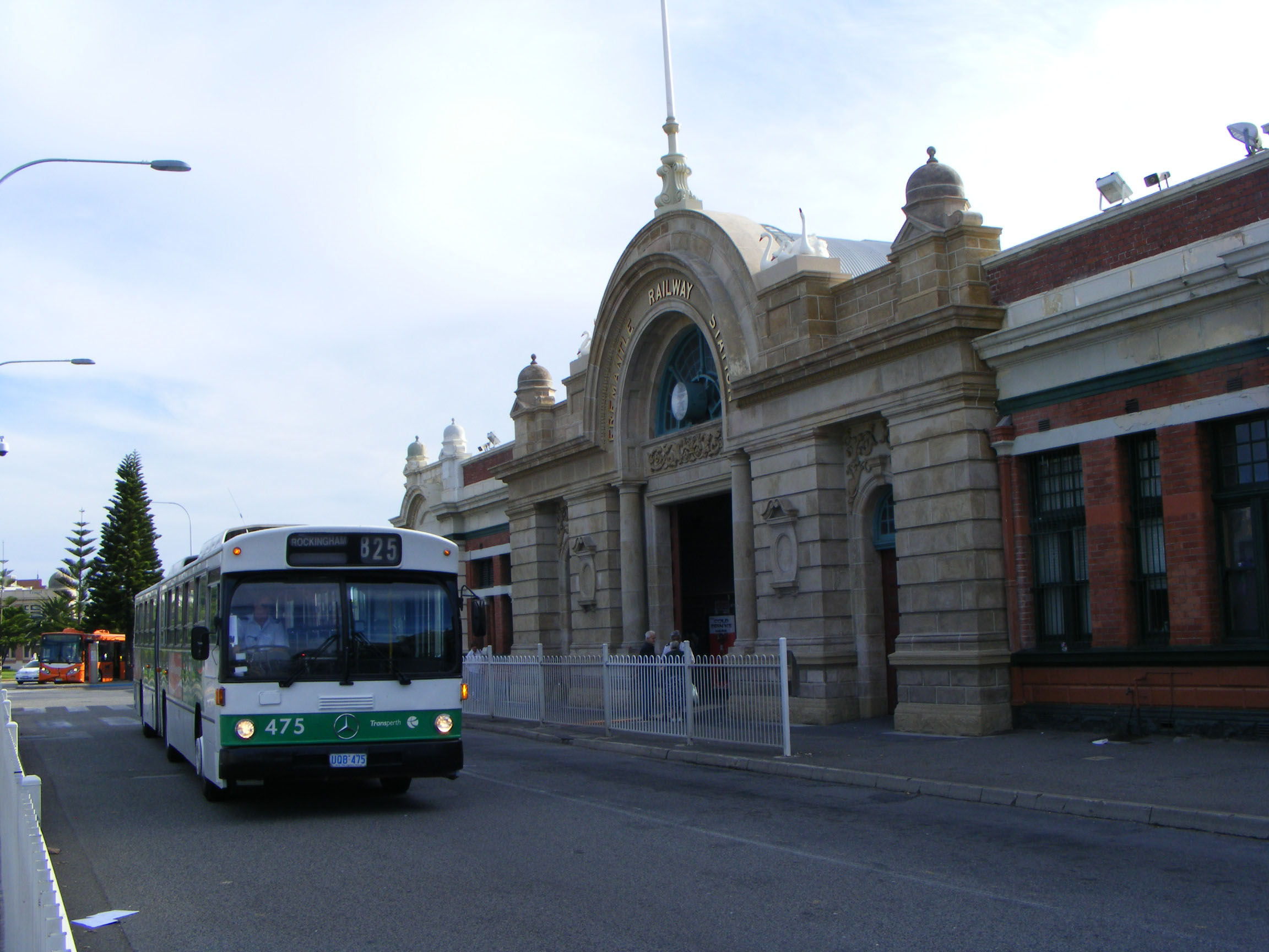 The attractive Fremantle Station forms the backdrop to this view of 475 over Easter 2009. The first articulated Mercedes buses were acquired for the Fremantle to Perth service with the intention of replacing the train service. This proved to be extremely unpopular with passengers and the powers that be relented and after a few years the train service was reinstated.