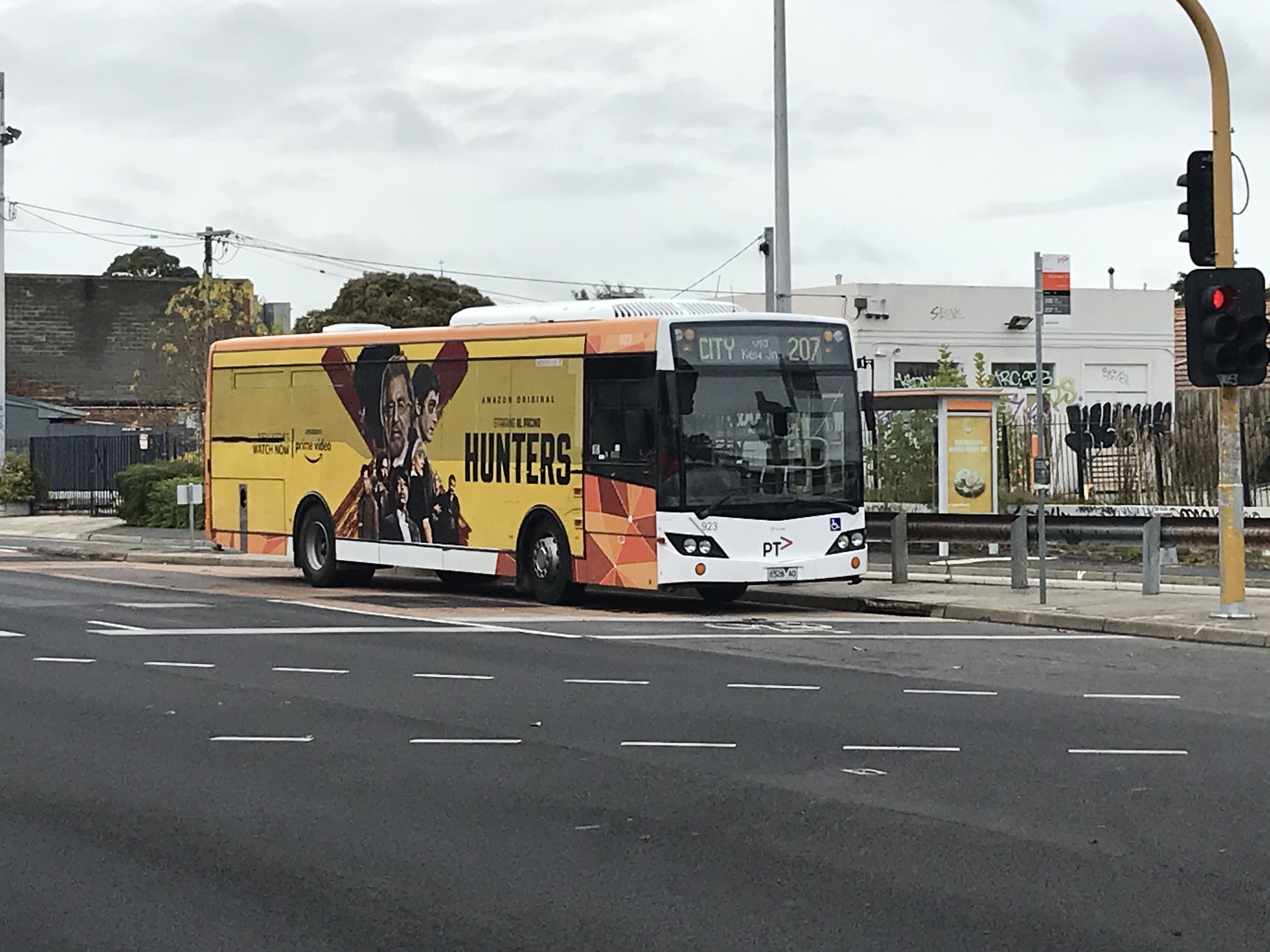 In April 2020 Custom CB60 Evo II bodied Scania K230UB 923 (6526AO) of 2007 picks up passengers in Abbotsford as it heads into the city on the 207.