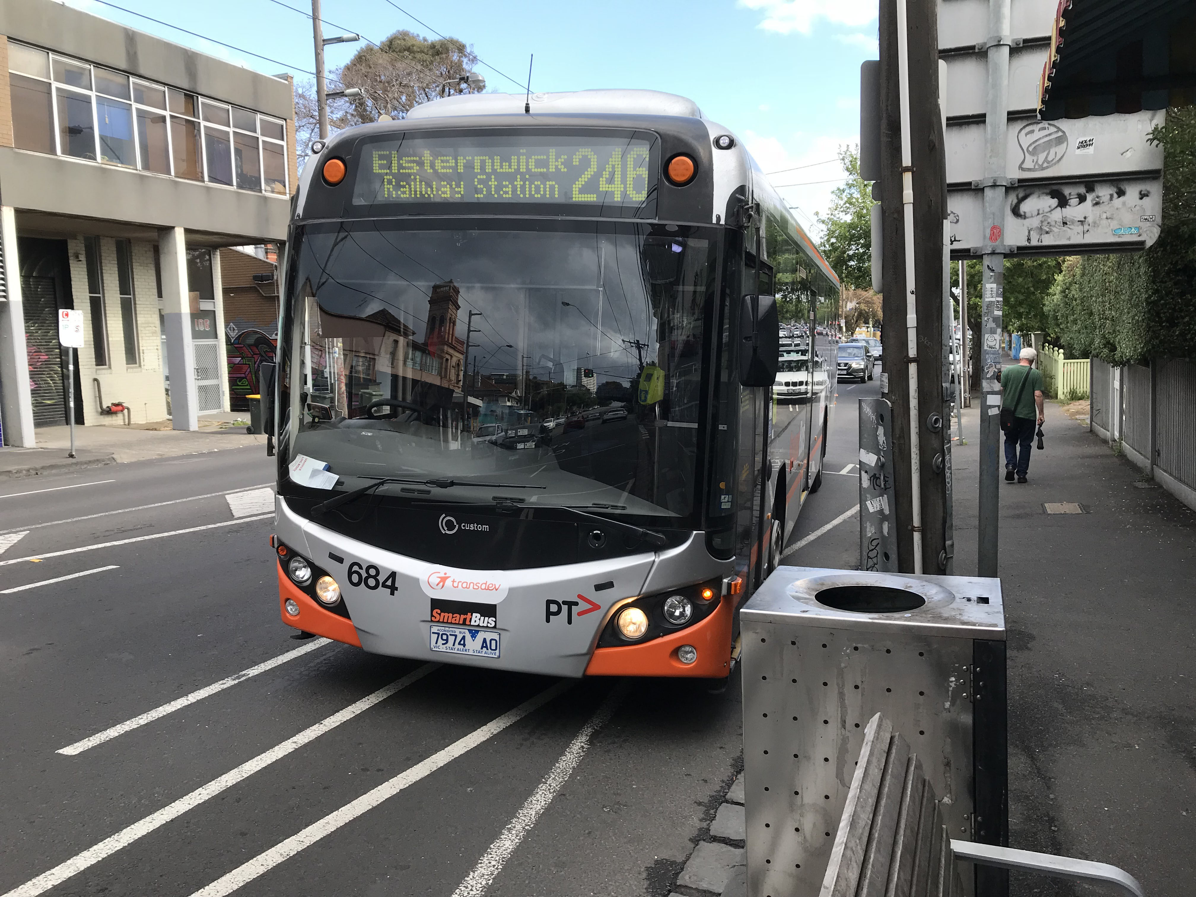 One of the five Custom CB80 bodied MAN 18.310 bought in 2010 for SmartBus work by Ventura, 684 (7974AO), was caught in St Kilda moonlighting on the 246 in November 2018.