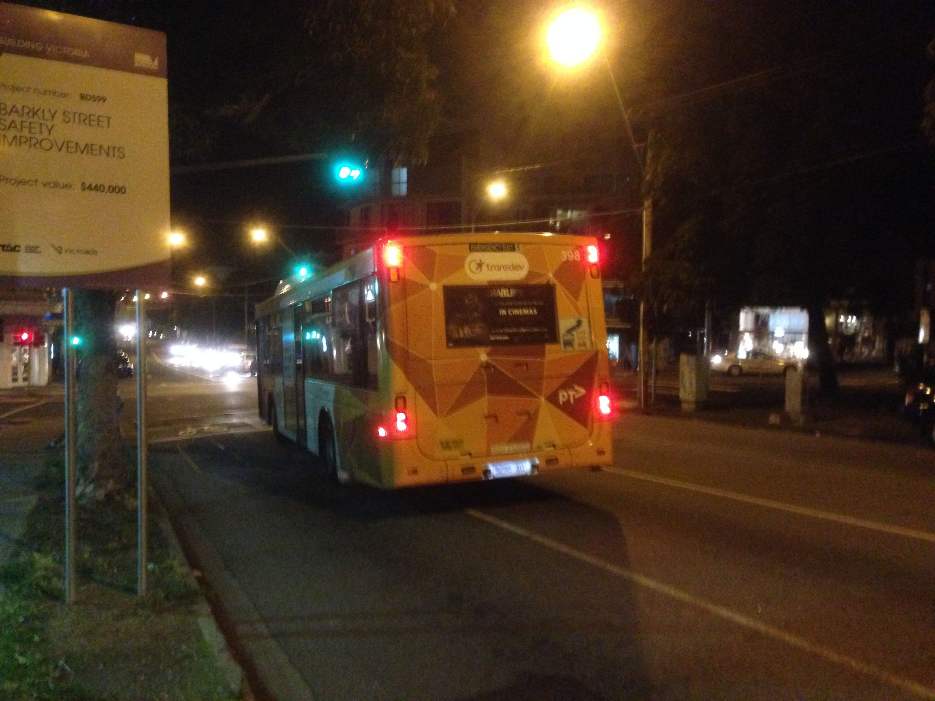 At the Barkly Street/Carlisle Street junction is St Kilda one evening in February 2015 is 2005 Volgren CR228L bodied Scania L94UB 394 (5294AO).