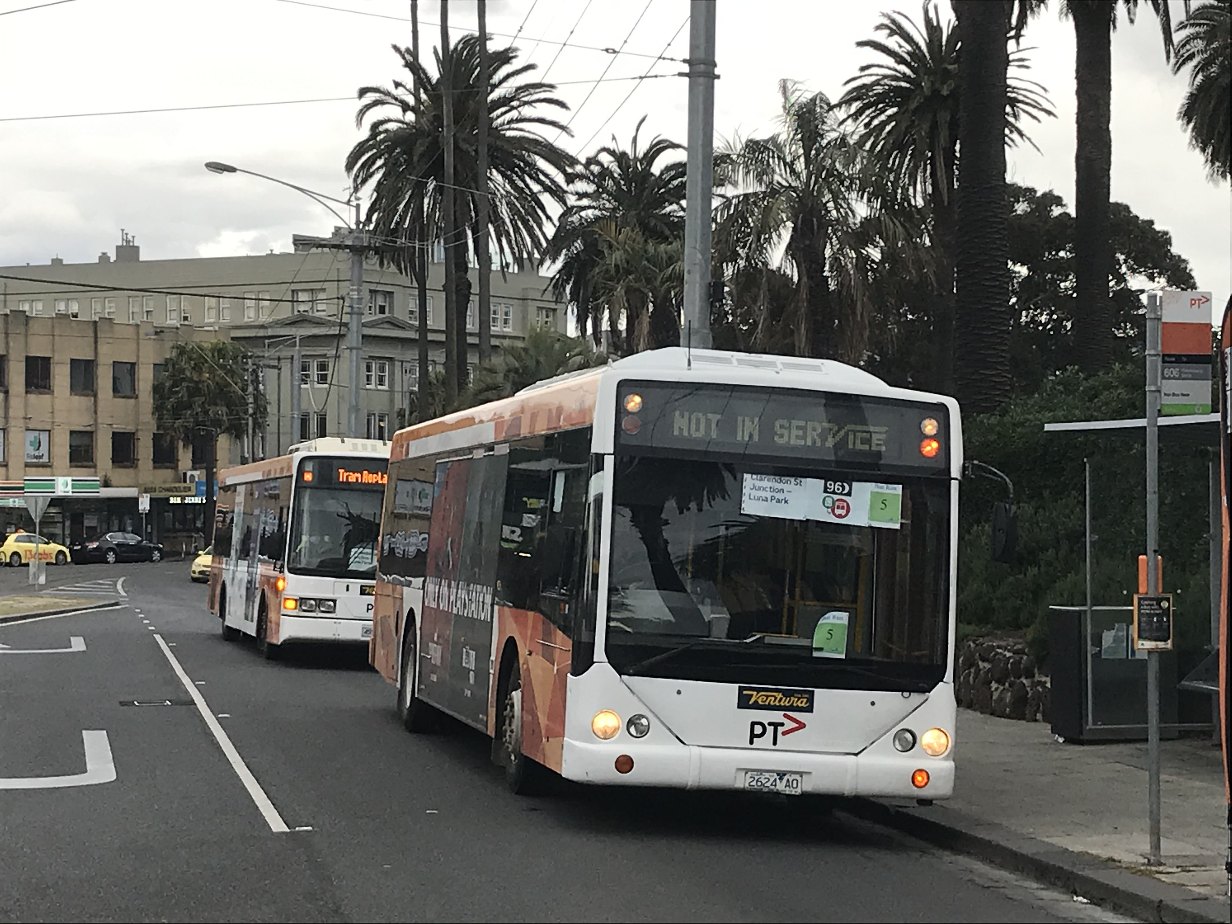More tram replacement work for CB60 bodied Scania L94UB 1195 (2624AO) in September 2020. The repalcement buses do not proceed to the tram terminus in Acland Street, it is much easier for them to turn at Luna Park. The 2001 Scania has now been withdrawn, the unidentified old Volgren behind has likely suffered the same fate.