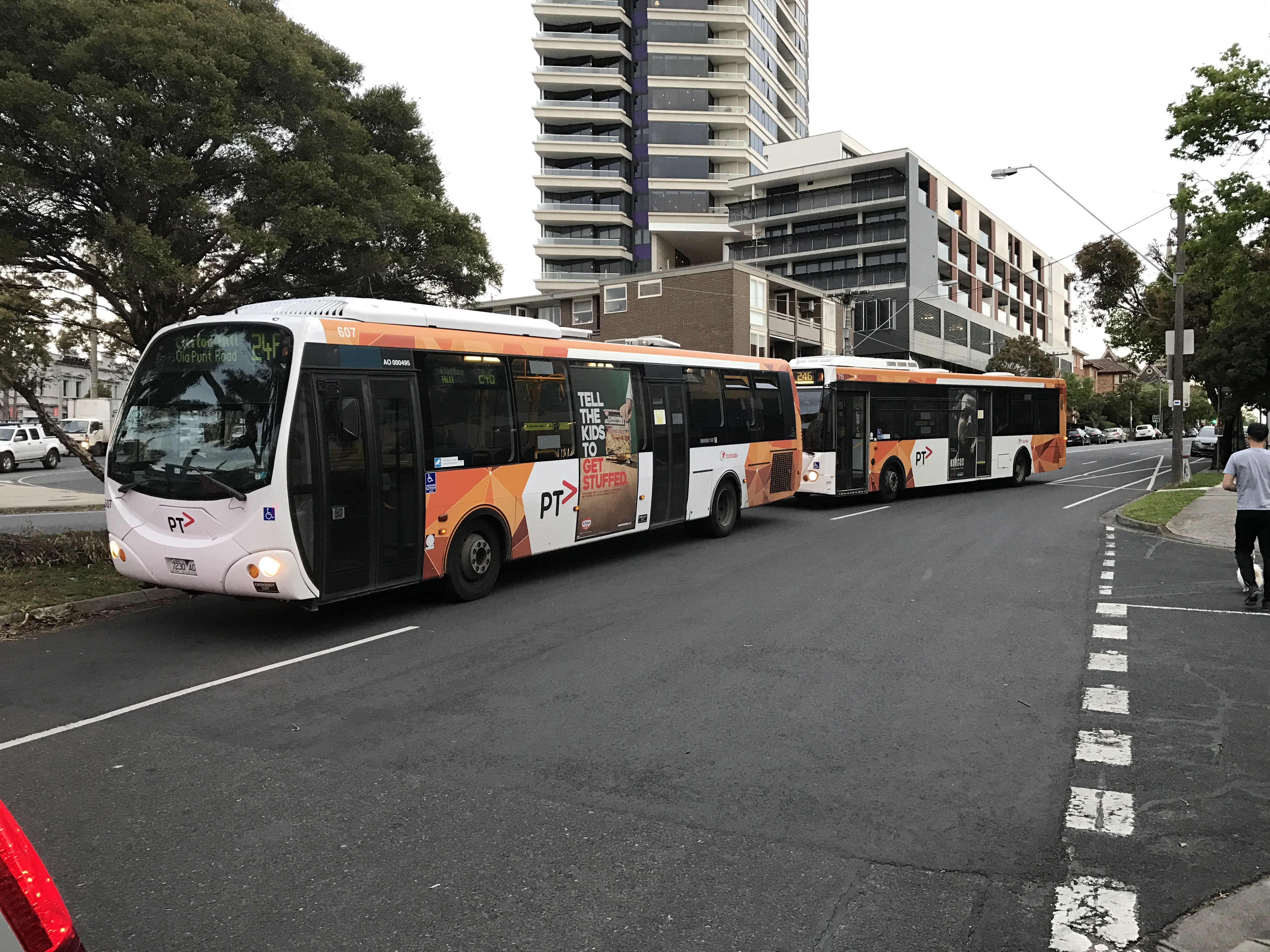 Another Designline bodied MAN 16.240, 594 (6858AO) was seen at La Trobe University in May 2018 on one of the services penetrating the campus. Off to the right is the Navya driverless bus being trialled on a campus based route. In addition to a conductor, when in motion it was accompanied by a car in front with a flashing light! Shades of the early motor cars which required a man with a red flag to walk in front.