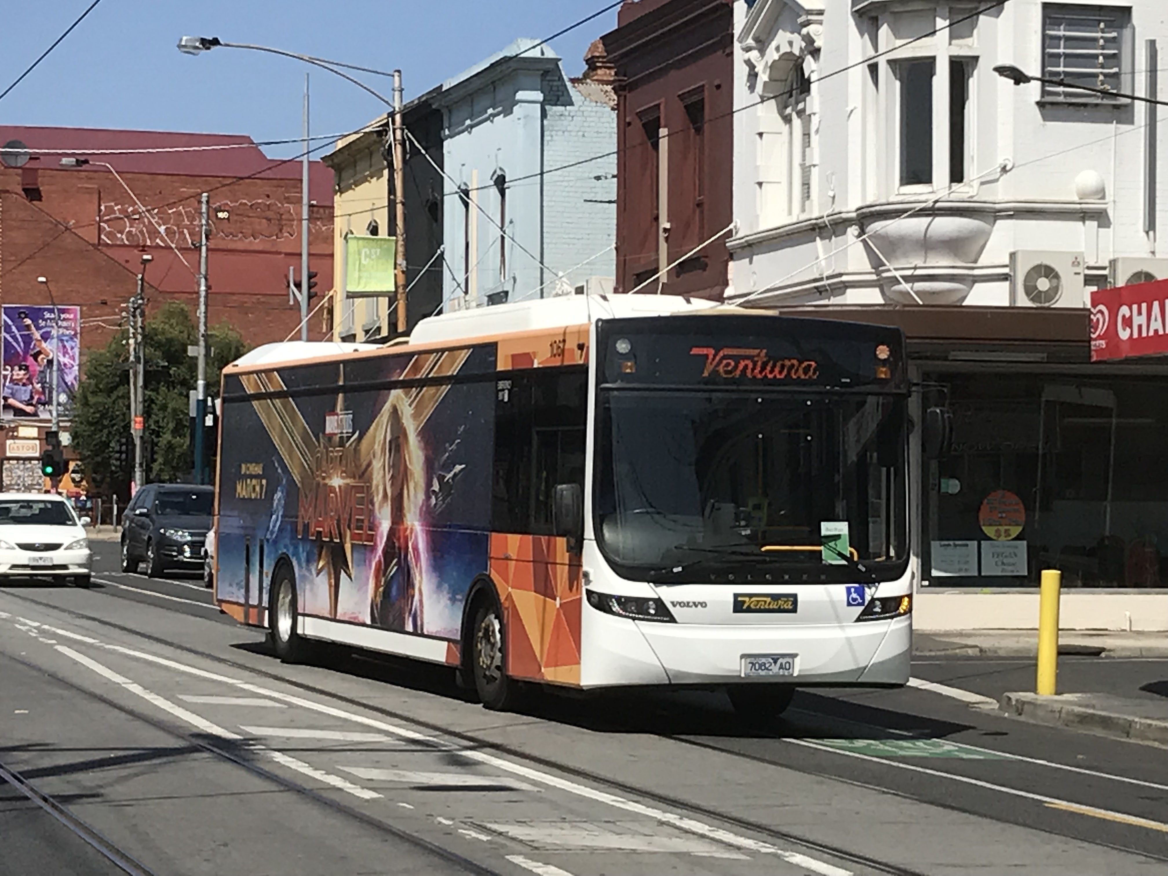 Over Easter in April 2018 the PTV were causing the usual major travel disruptions, in addition to rail replacement services on several lines, tram trackwork on St Kilda Road had Ventura providing a fleet of buses to replace the trams. Here is B7RLE 1067 again with five section Yarra Trams' Siemens Combino 5020 at the bus/tram interface.