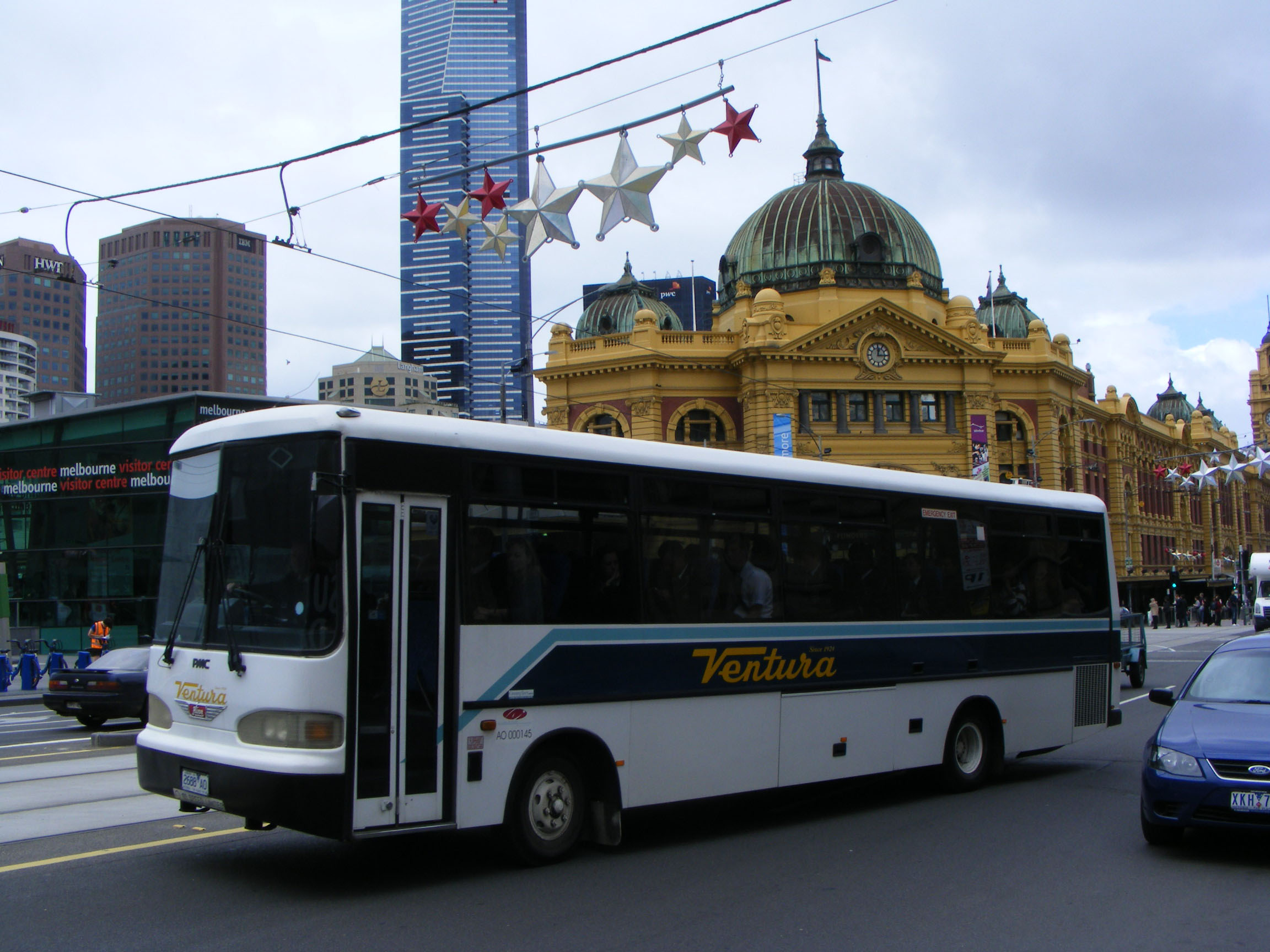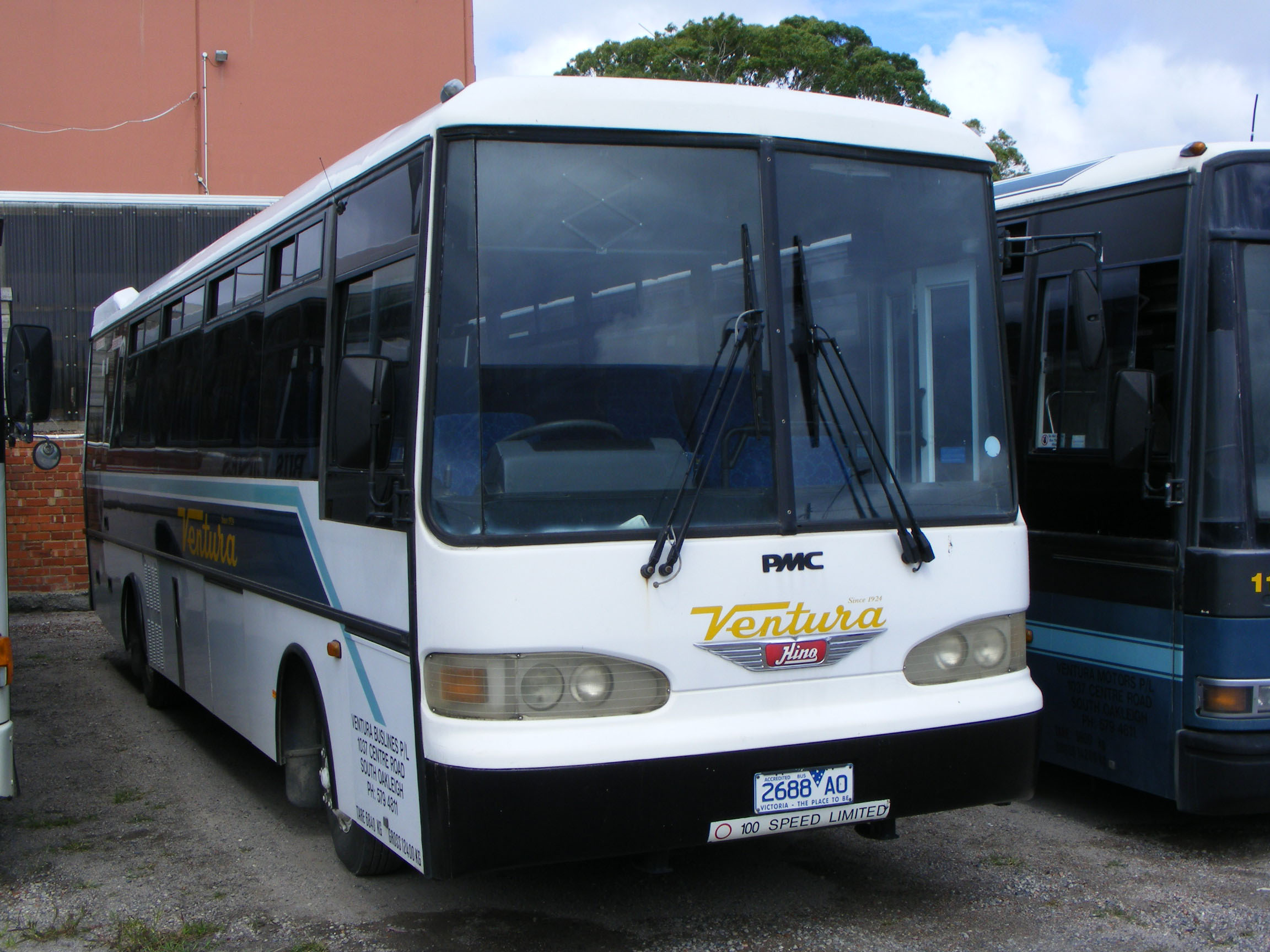 Two contrasting members of the Ventura charter fleet seen at Oakleigh in April 2010 are 117 (2688AO), a 1996 Hino BD186K with PMC's Cadet body and 114 (2676AO) a MAN 16.240 with Custom body dating from 1993 but new to Mount Dandenong as 50 (FFM774). |