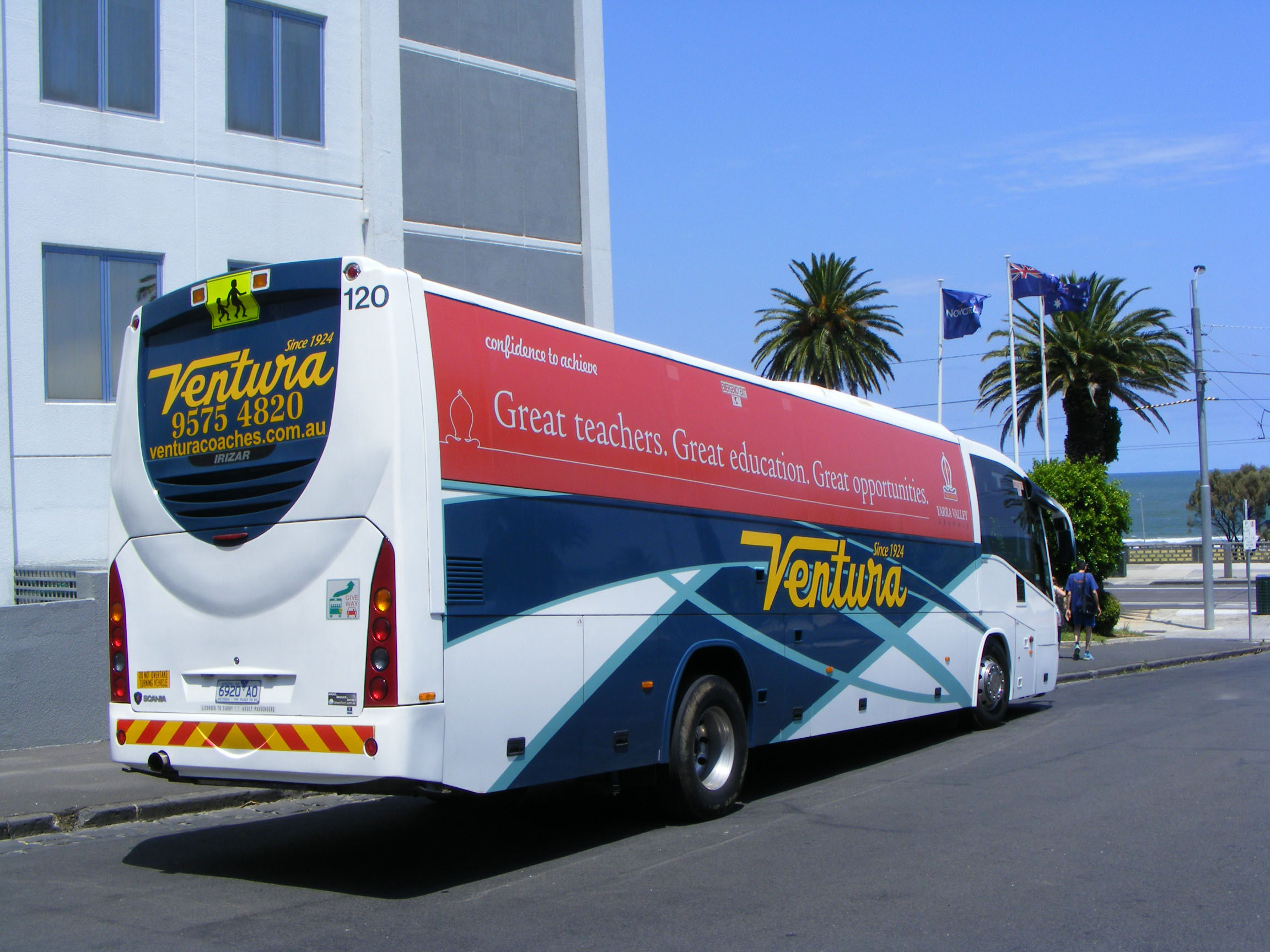 An unusual practice, particularly for a coach where as a passenger you might expect to enjoy the view of a sightseeing trip, Scania 120 (6920AO) has its windows plastered with an advert. Doubtless the advert is see through, but passengers will be peering through a sea of dots. The advert is for Yarra Valley Grammar School. The coach is a Scania K270IB and was seen in January 2012 outside St Kilda's Novotel.