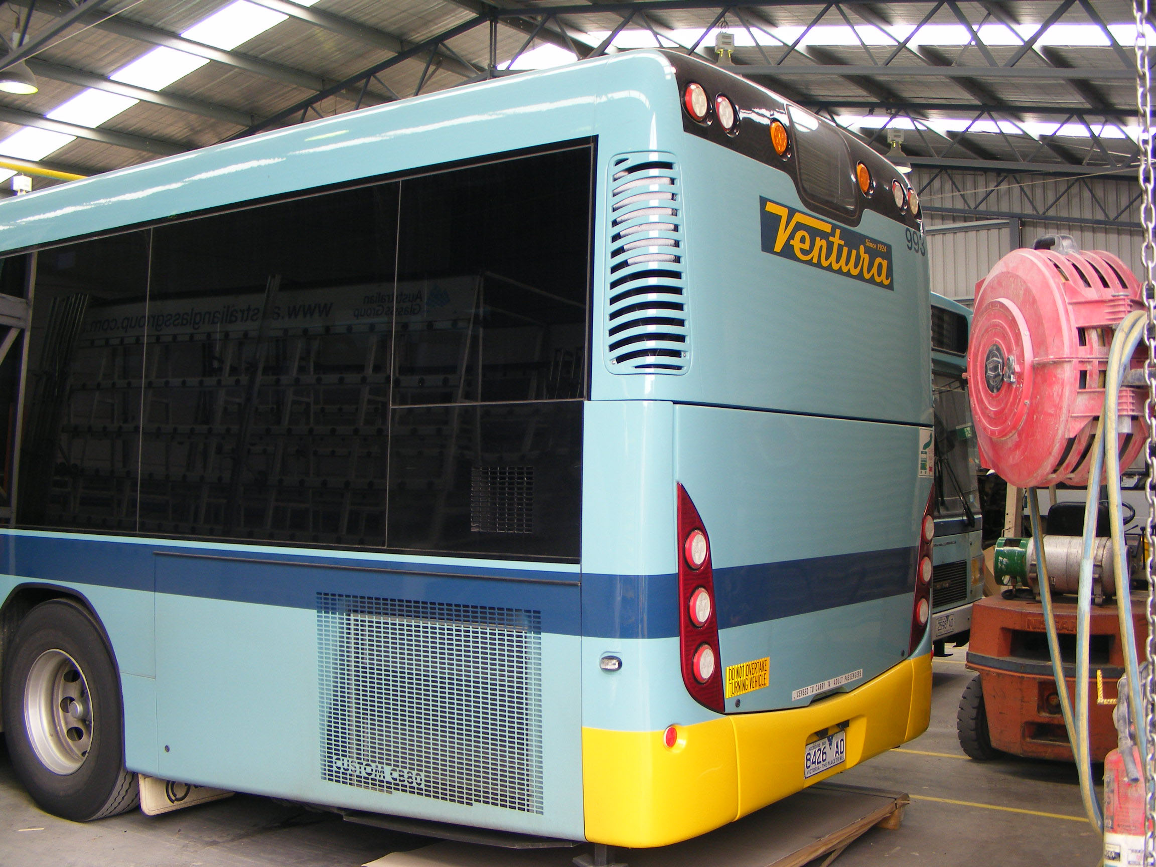 Whilst a batch of CB80 bodied MAN buses entered service with National Bus on SmartBus routes, only one CB80 in Ventura blues arrived. The Scania K280UB, 993 (8426AO), was purchased ex dealer stock. It is seen in Knoxfield depot in February 2012, being readied to enter service from Croydon. With the advent of the new Ventura-Grenda white based livery, 993 is likely to be the only CB80 in two tone Ventura blue. |