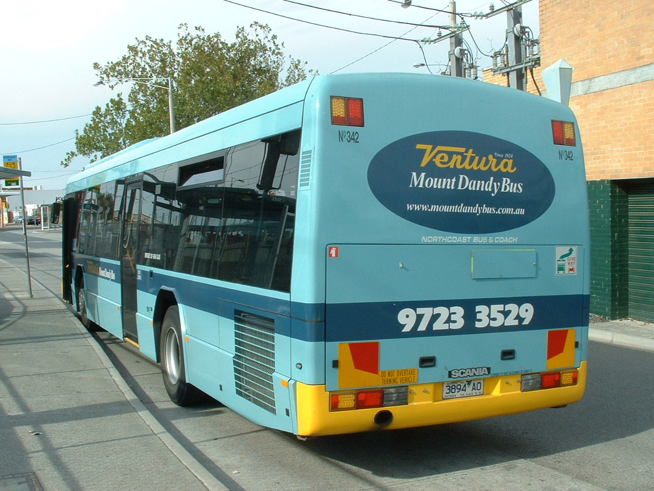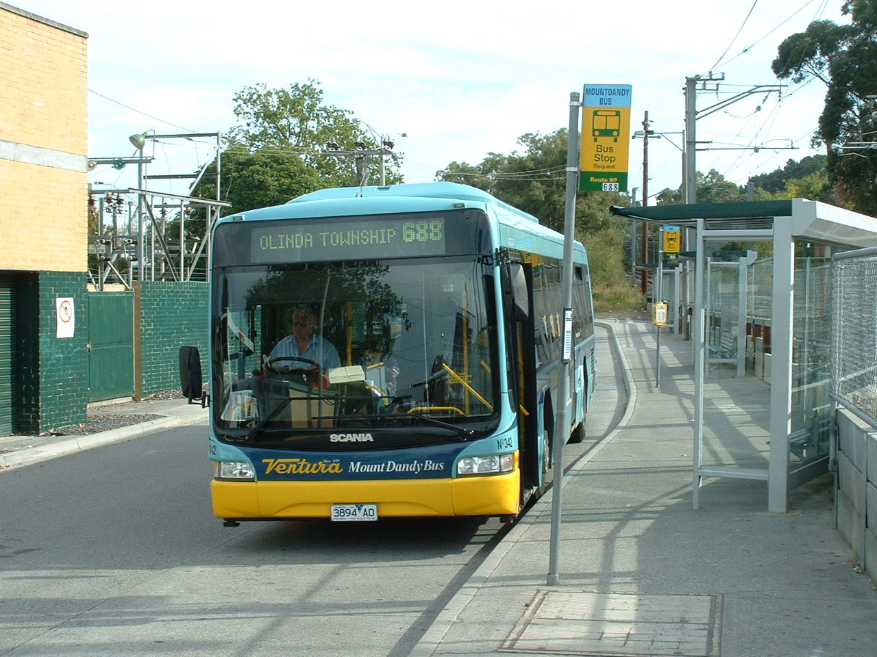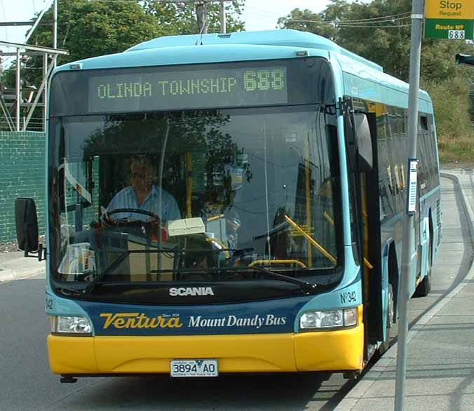 Scania L94UB 342 (3894AO) has the later Downtown City Bus style of body. It is seen at Croydon Station in April 2004 when around 18 months old. Of interest is the dual Mount Dandy Bus and Ventura fleetnames on the Ventura livery. No doubt the bus was delivered in the colours. Note also the MOUNTDANDY BUS bus stop sign.