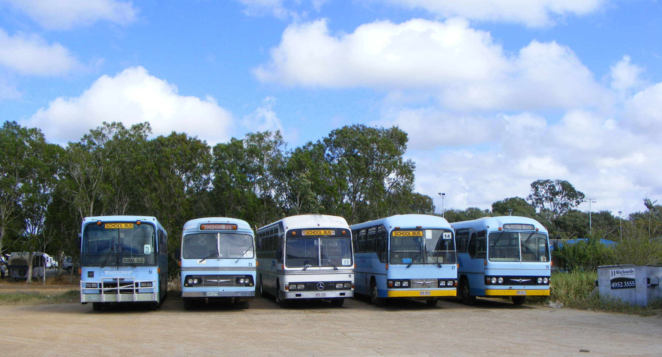 Five elderly school buses in a variety of liveries are lined up at the depot in August 2009. From the left are 51 (082PYG) a Volvo B6FA with Volgren 53 seat coachwork ex Daly's Bus Service, 25 (694EPN) a Nissan PRX102D with Custom Coaches 61 seat bus body ex Tamworth Coaches, in white livery 19 (400JSE) a Mercedes Benz OC1617 also with Custom Coaches 61 bus seated body ex Berrima Coaches of Mittagong, 27 (804HKA) a Nissan UD RB30 Custom 61 seat bus bought new and similar Nissan 20 (895HLI). |