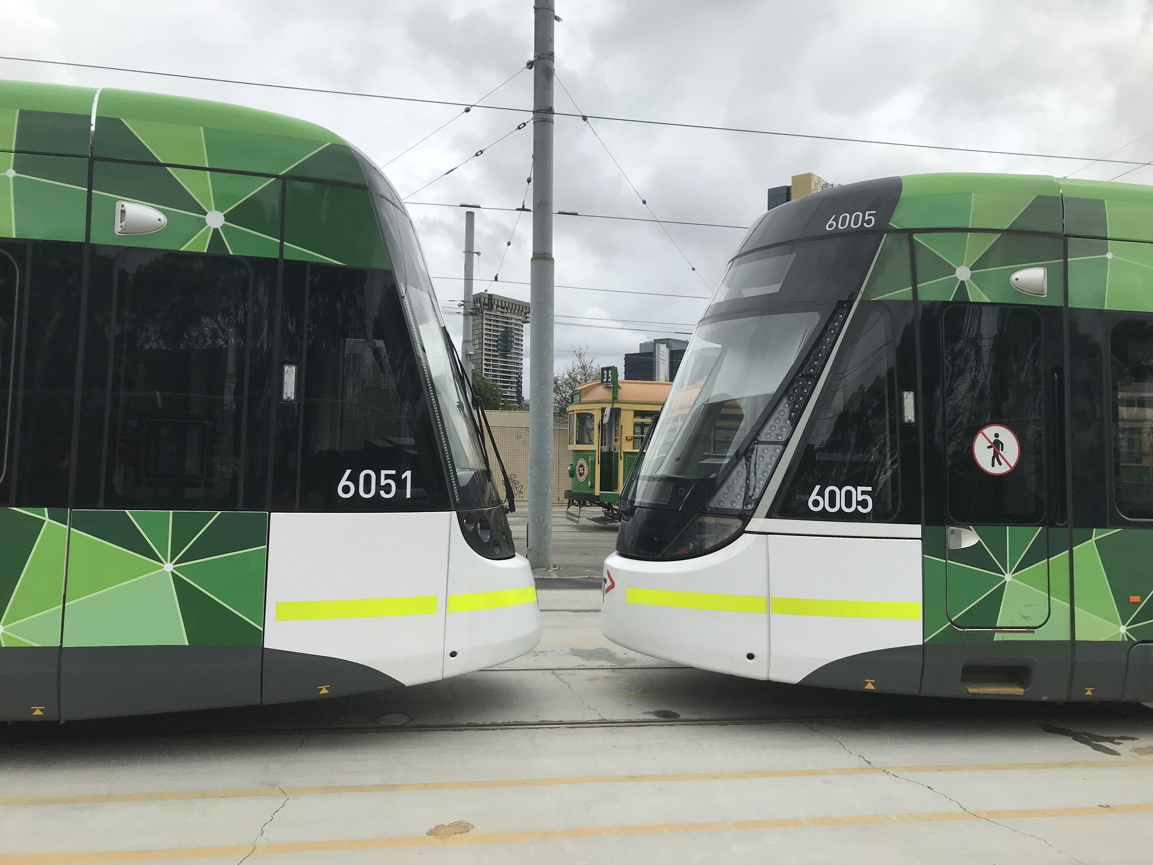 Old meets new at the Southbank depot in December 2017. The first of the second fifty Bombardier Flexity Swift trams for Melbourne, 6051, meets early model, 6005. The obvious differences are at the front end. Newer 6051 is less elegant with steeper raked windscreen and a more domed roof. The redesign aimed to reduce glare for drivers. Inside more hand holds were added to counter some safety concerns.