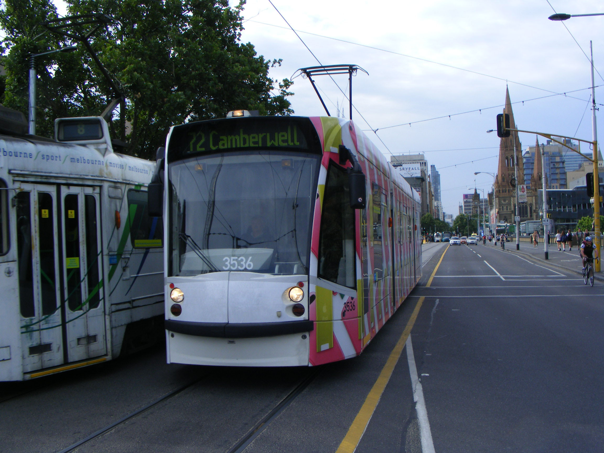 Having just crossed Princes Bridge and heading for Camberwell on the 72 is 3536 advertising iPod in November 2012. A Z class tram on the withdrawn route 8 heads into the city.
