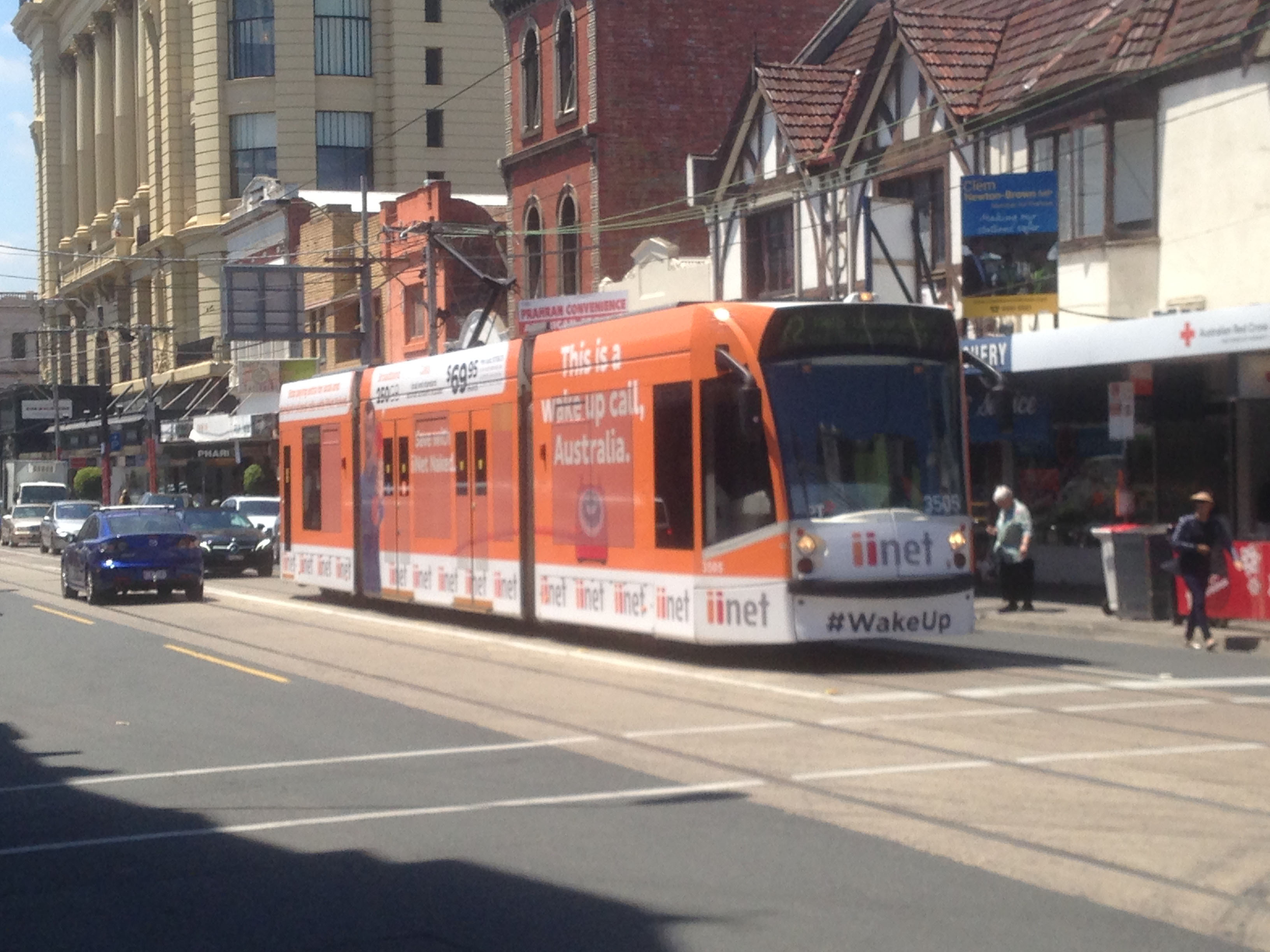 Having just passed the Shrine of Remembrance in April 2015 Combino 3505 had acquired a different iinet advert whilst sister tram 3503 heads a bit further along St Kilda Road, but is about to vere down Park Street on route 8 on its way to West Coburg.