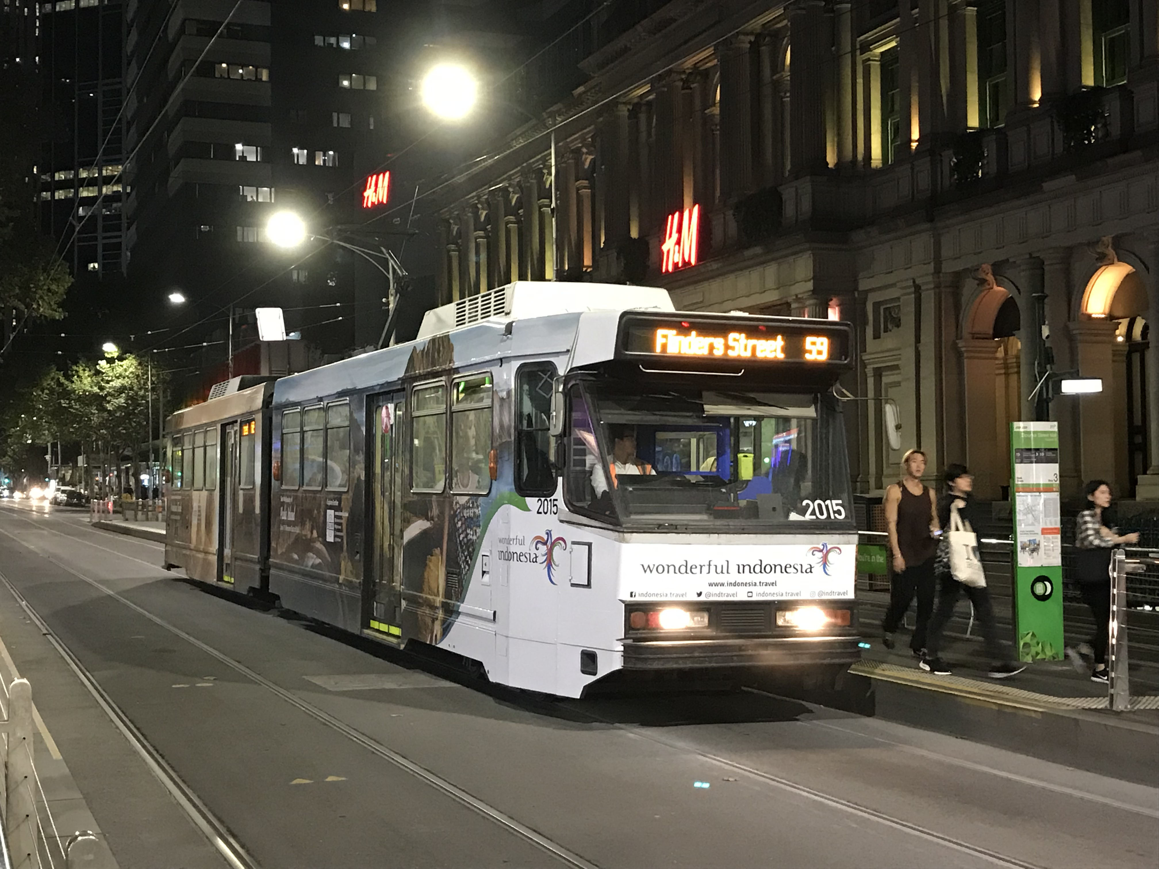 Forward to April 2019 for this night shot of Class B 2015 on Elizabeth Street at the Bourke Street Mall stop outside H&M in yet another Indonesian wrap.