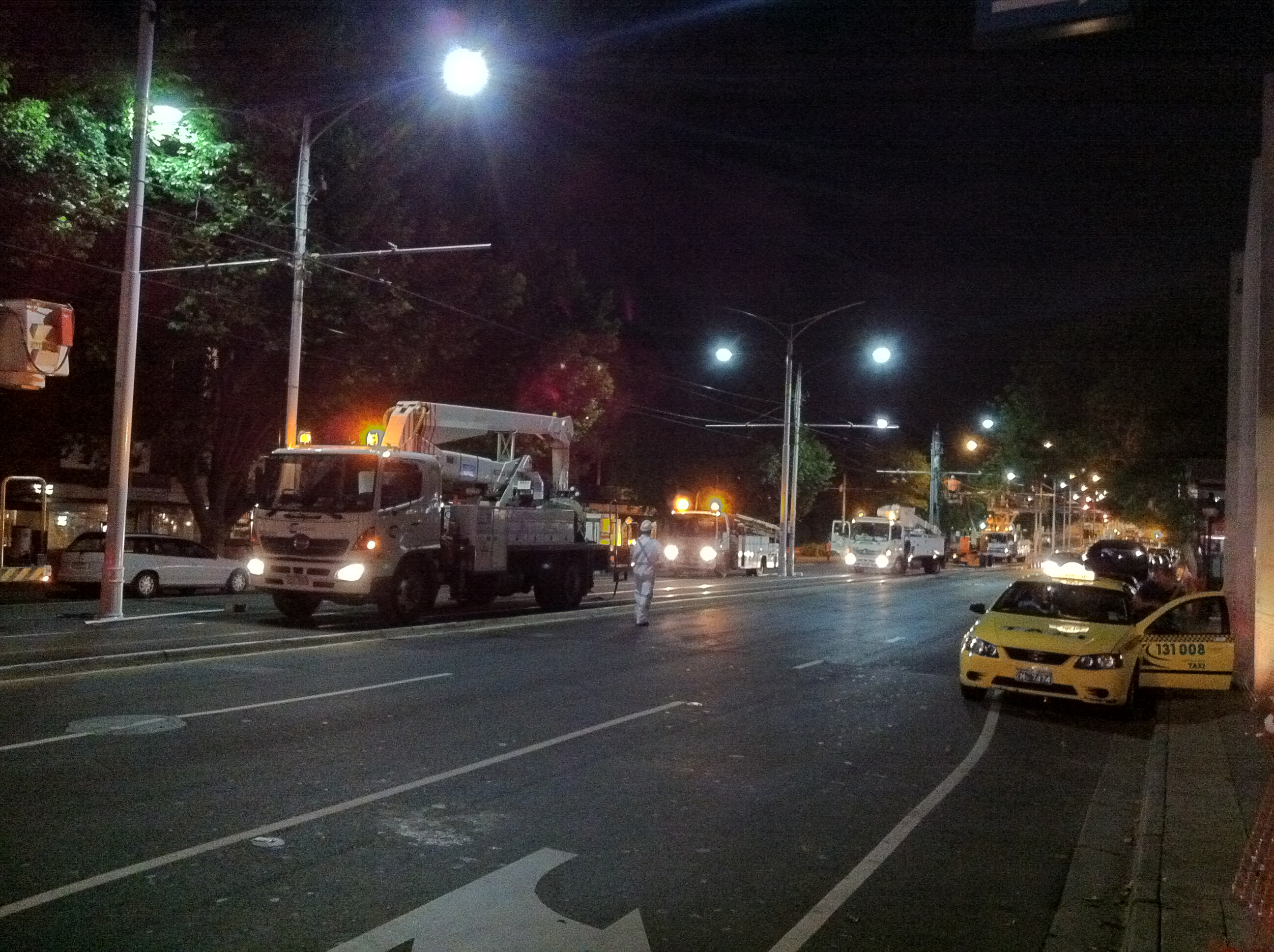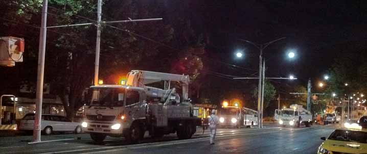 When most people have gone to bed, Yarra Trams' maintenance crews spring into life. This scene is 11.30 in the evening of November 14th 2011 on Fitzroy Street in St Kilda. The last trams of the evening have been replaced by buses and the crews are preparing to work on the track overhead.