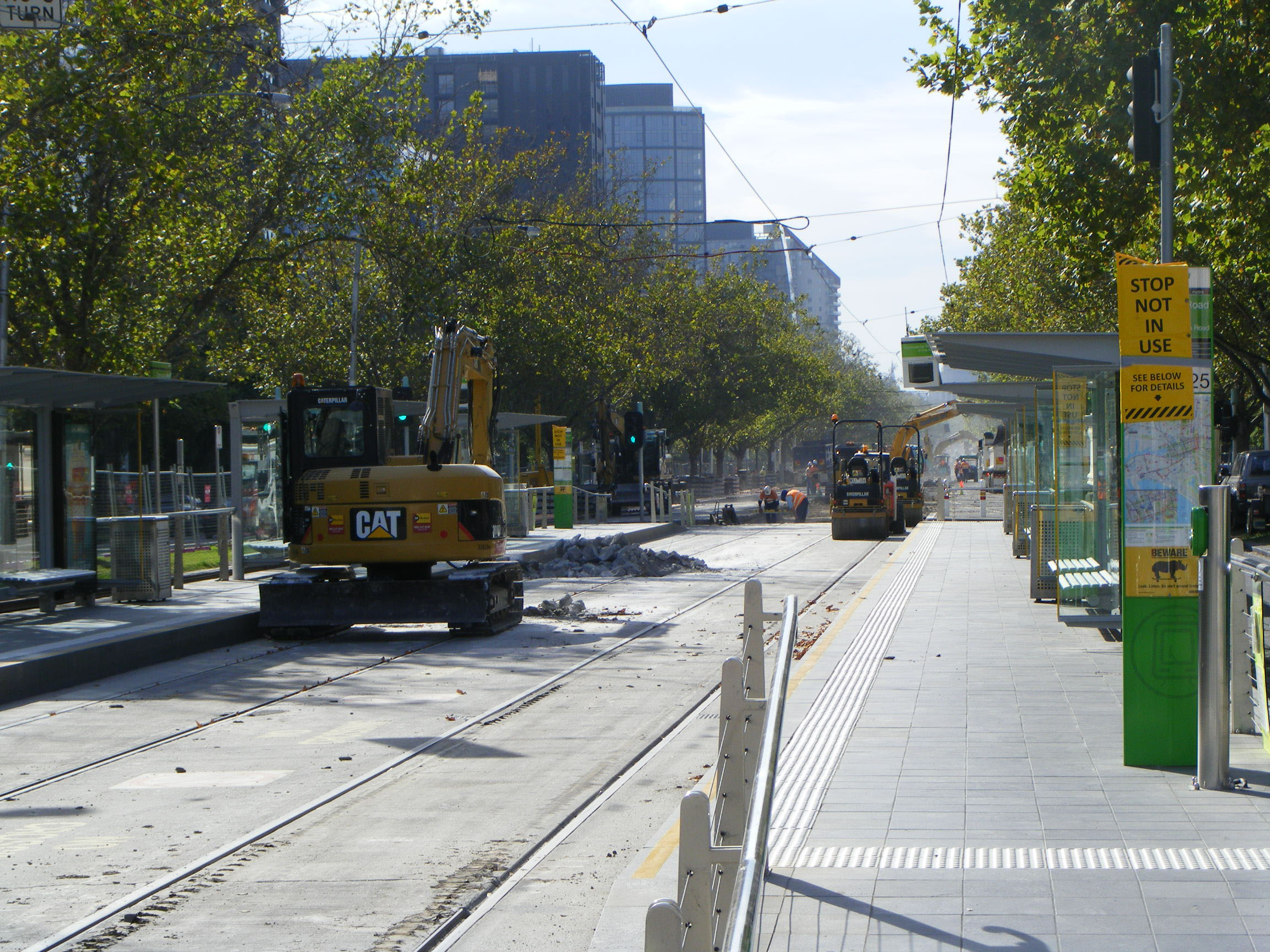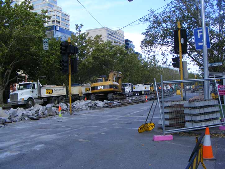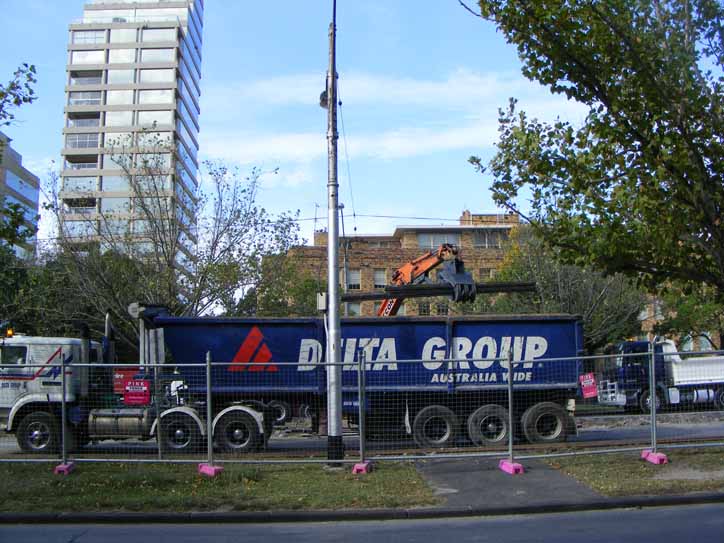 Major works were undertaken on St Kilda Road over Easter in 2012. A large section of the tramway was completely renewed resulting in the closure of a long section from around Lorne Street up to and including the Domain Interchange. The latter was only out of action for a short time for some surface repairs to the track bed on the curved section. However it was wholesale destruction back along St Kilda Road. Shuttle buses bridged the gap in service between start of the works and the Arts Precinct, which was the easiest place to turn the buses back.