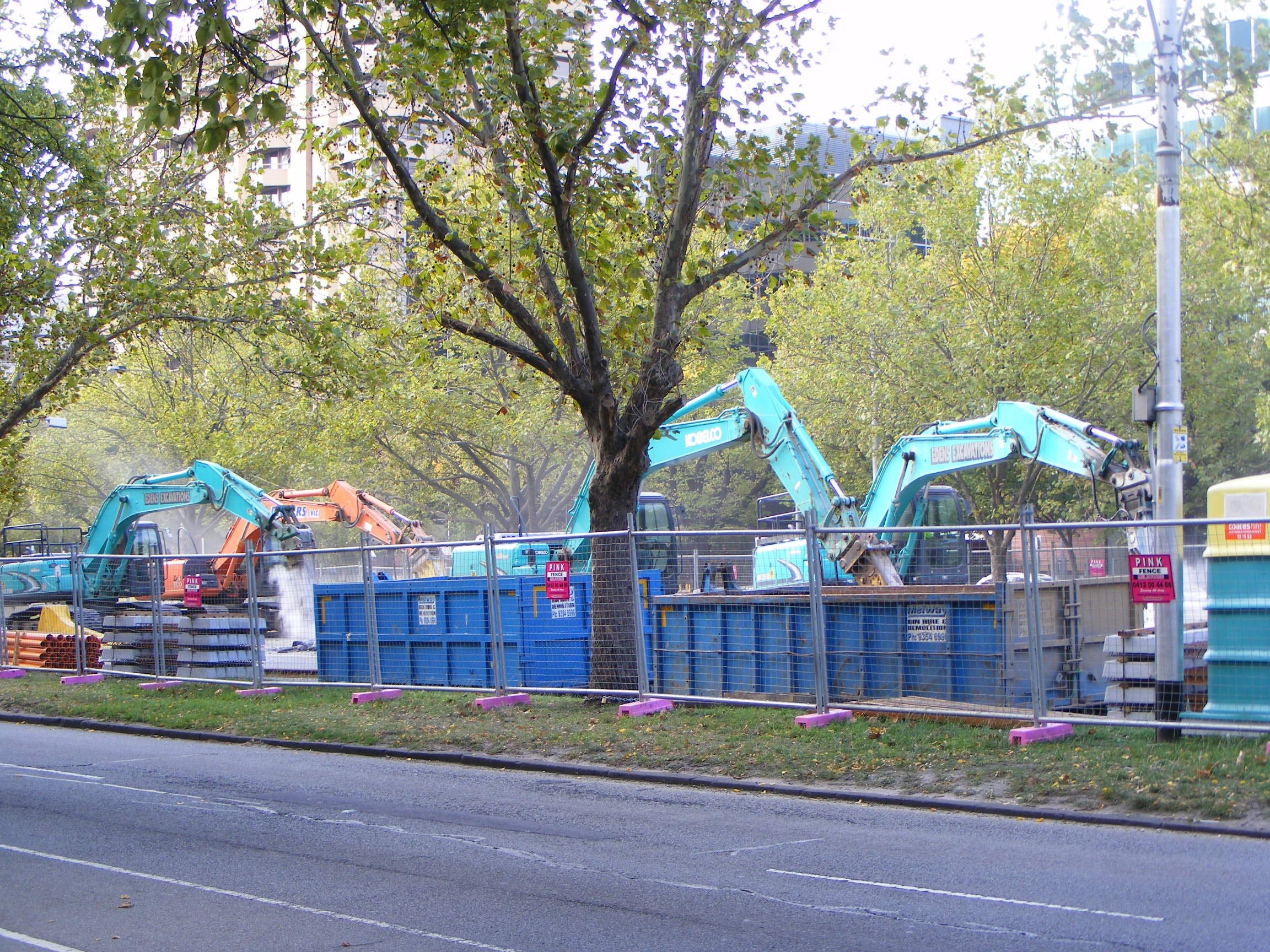 Here four jack drills are working to destroy a section of track. There were several sets of these machines working in groups of around nine along the length of St Kilda Road.