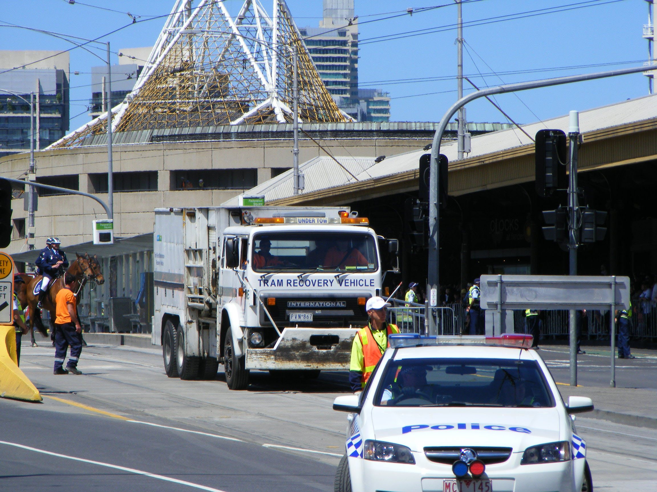 An occasion when everyone was hoping that Yarra Trams International tram recovery vehicle, PVN867, would not be needed. It is outside the front of Flinder Station on the occasion of Her Majesty's visit to Melbourne on October 26th 2011. The Queen was due to travel on the specially prepared Royal Tram, Z3 158. The tram was primarily in a red livery, which would no doubt have matched the faces of the Yarra Trams staff if 158 had failed and PVN867 had to be used to push the tram out of the way! However all went according to plan as can be seen in our pictures of the Royal Tram.