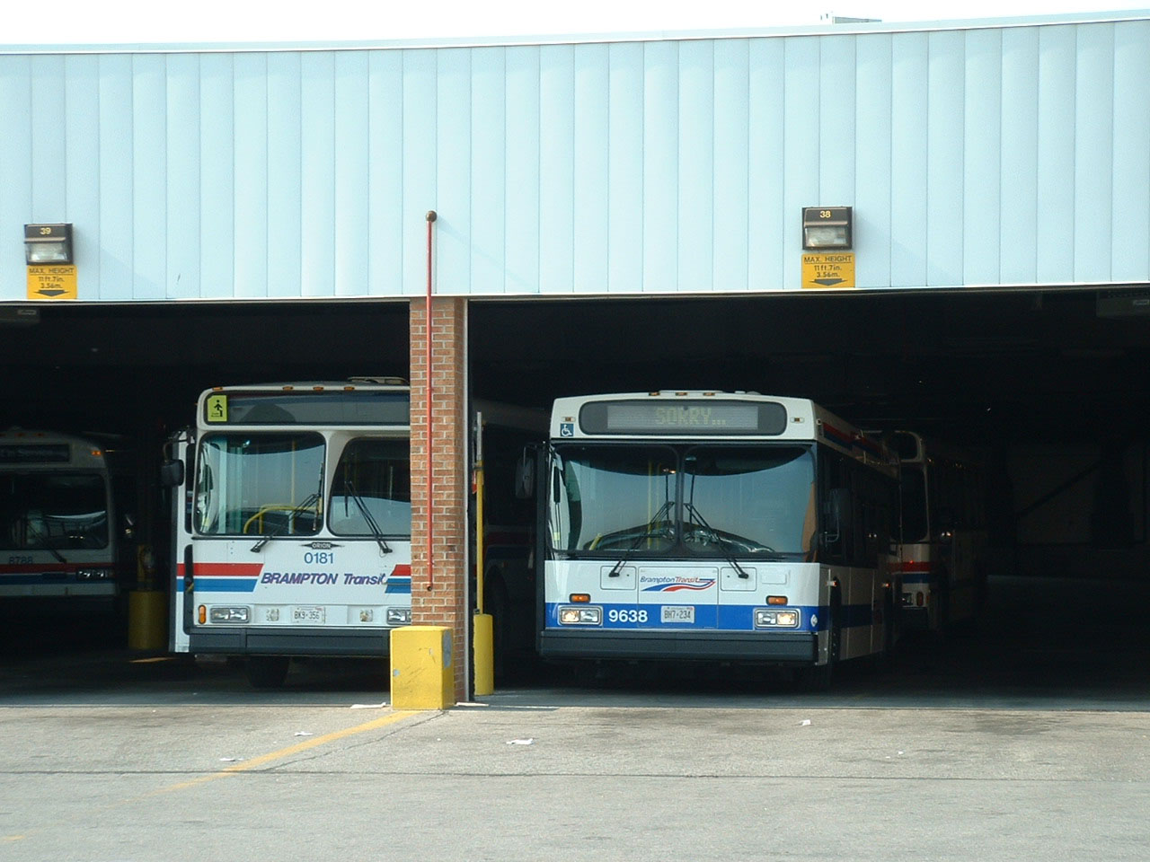 First of the trio of 1996 New Flyers, 9638, was seen in the sheds repainted in the new livery alongside Orion V 0181 seen earlier in 2003.