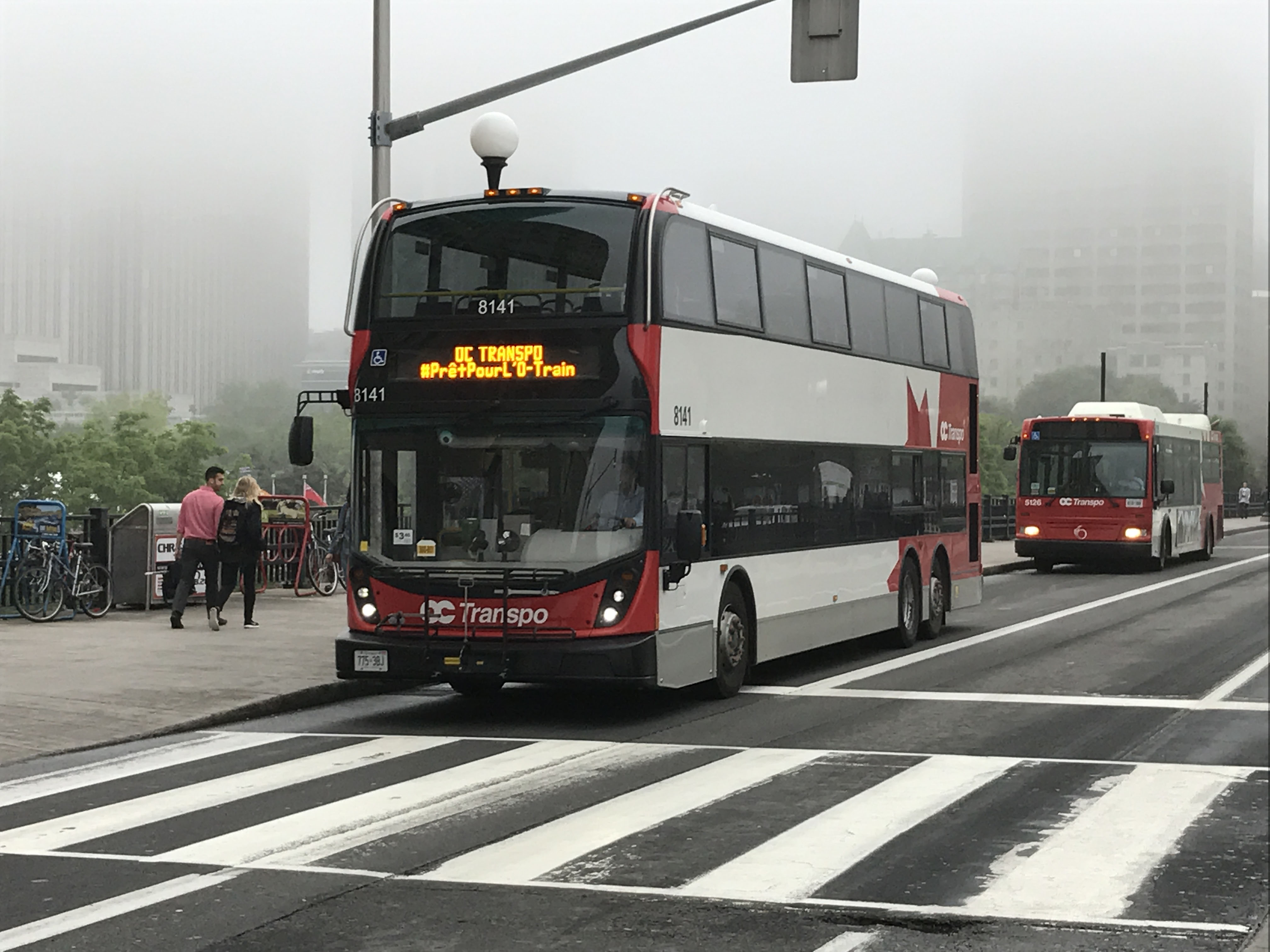 On the Friday before Canada 150 this is the morning the damp mist enveloping the city was the curtain raiser to the downpours set to follow on the Big Day. Enviro500MMC 8141 is being followed west of the Mackenzie King Bridge by Orion VII hybrid 5126.