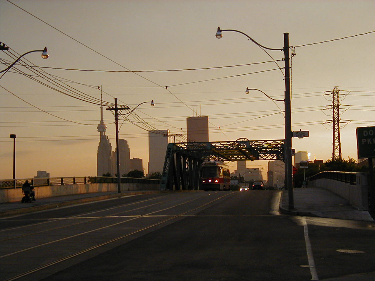 As the sun sets on a July evening, a CLRV is seen crossing the Don River silhouetted by the city skyline.