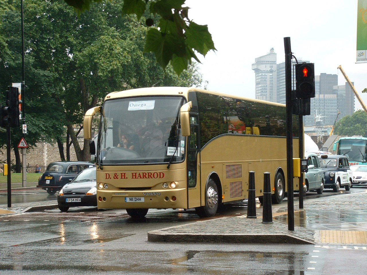Pouring rain near the Tower of London one summer Sunday in 2007, caught this Jonckheere bodied Volvo B10M of D & H Harrod of Downham Market in the summer of 2007 with cherished registration, N11DHH.