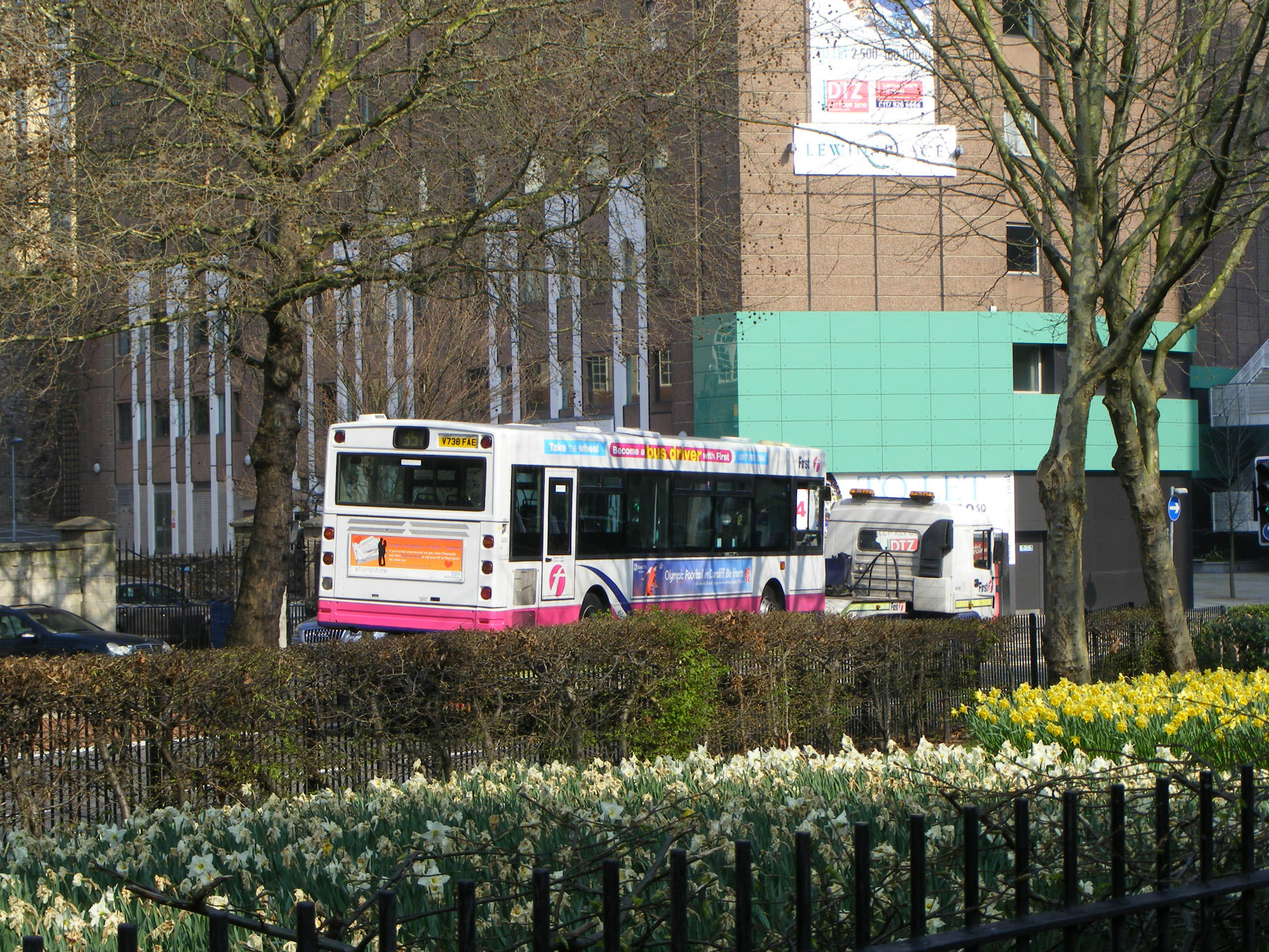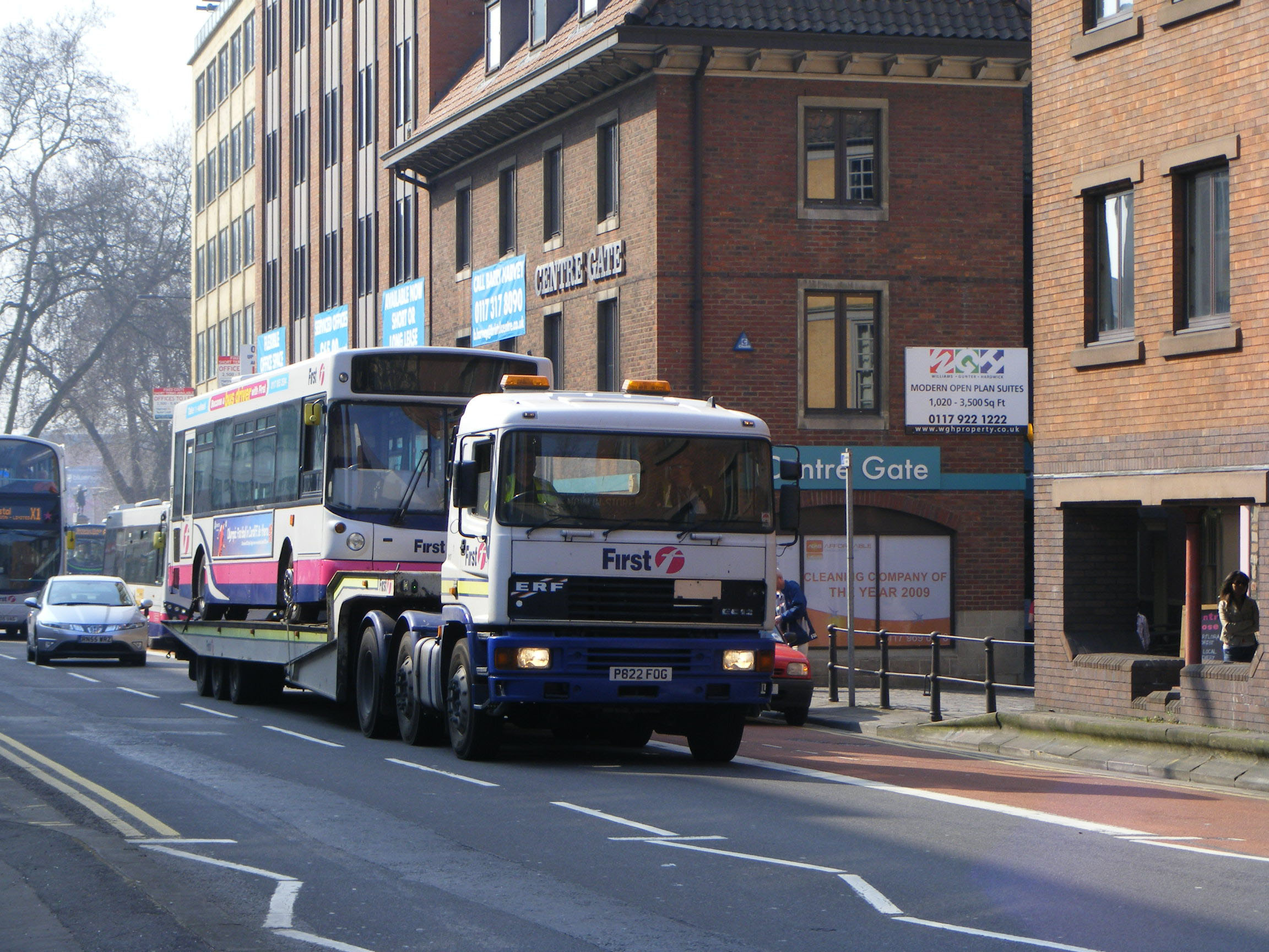Ignominiously leaving the city cnetre by a manner not intended was Alexander ALX200 bodied Dennis Dart SLF 42738 (V738FAE) aboard First's dedicated flatbed ERF trailer unit, P822FOG.