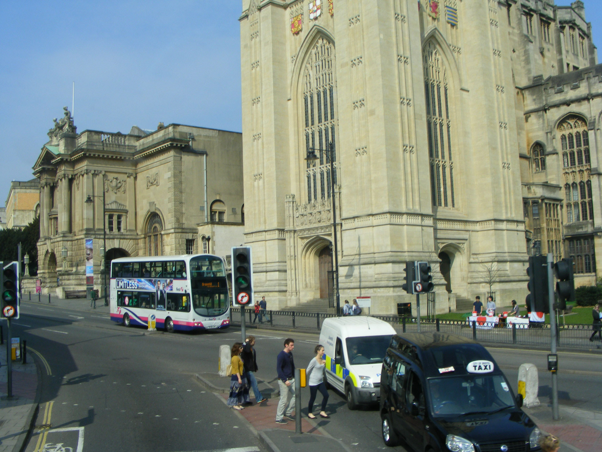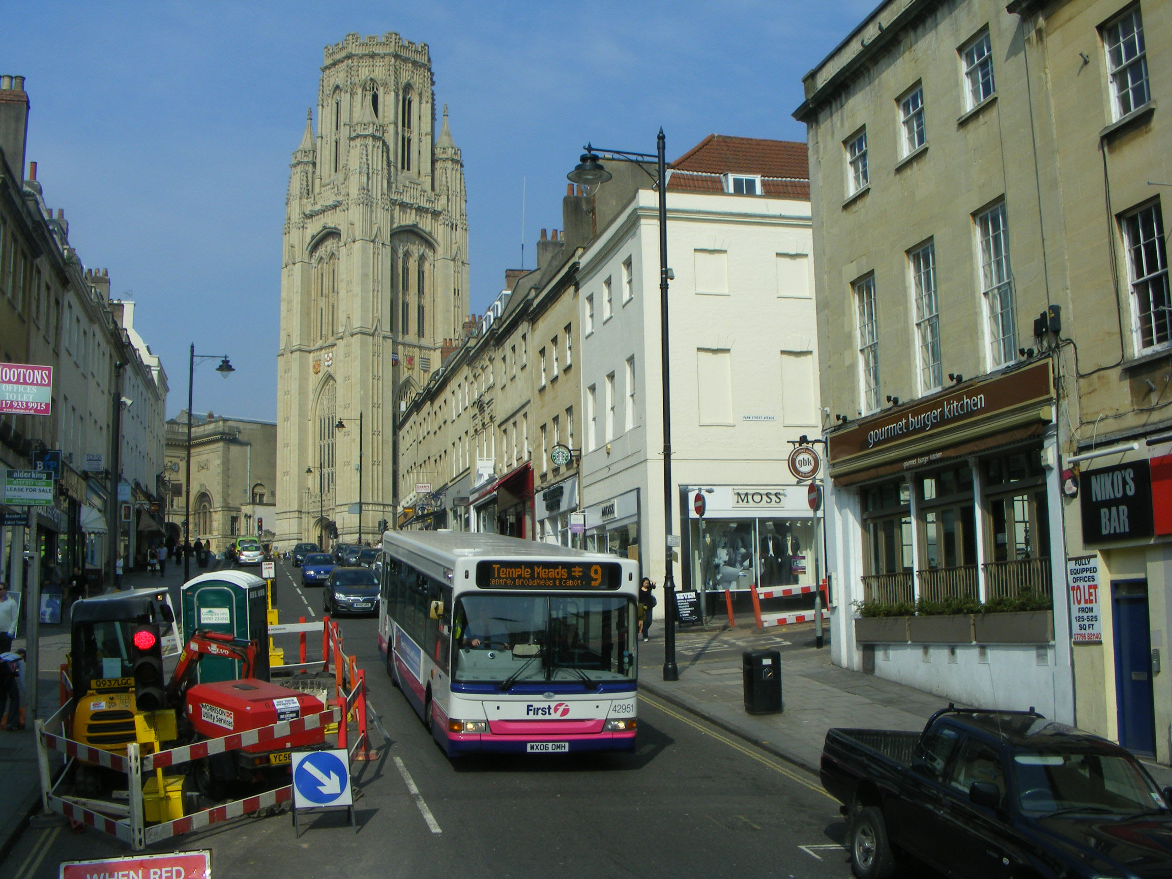 Descending Park Street with the University's Wills Memorial Tower behind is Alexander Dennis Dart SLF 42951 (WX06OMH). The taxing hill often saw Bristol FLF Lodekkas issuing steam from a valve above the bonnet and filling the space next to the half cab!