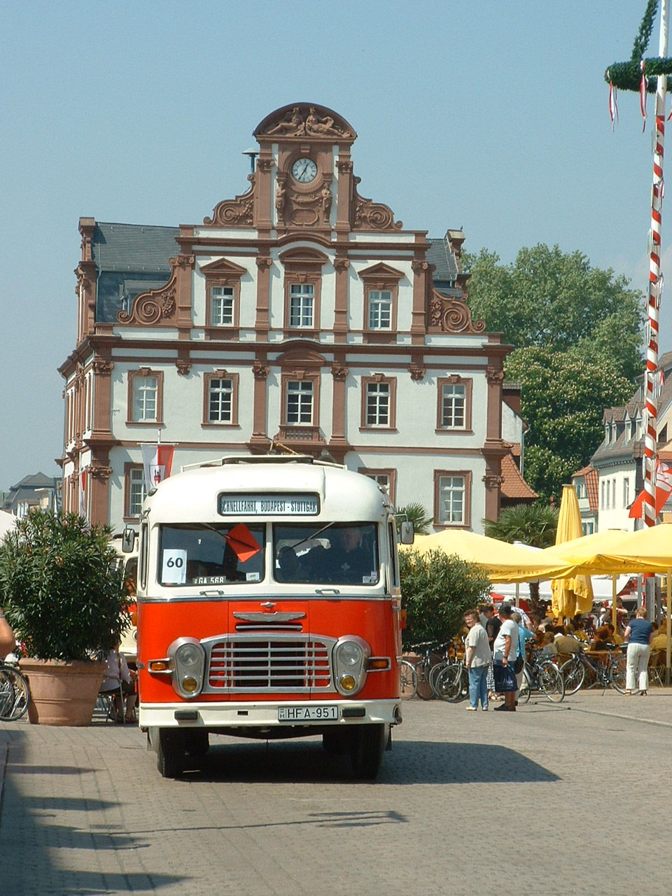 Wings out-stretched, and having paused in the town centre, the Budapest bus prepares to journey on to Sinsheim.