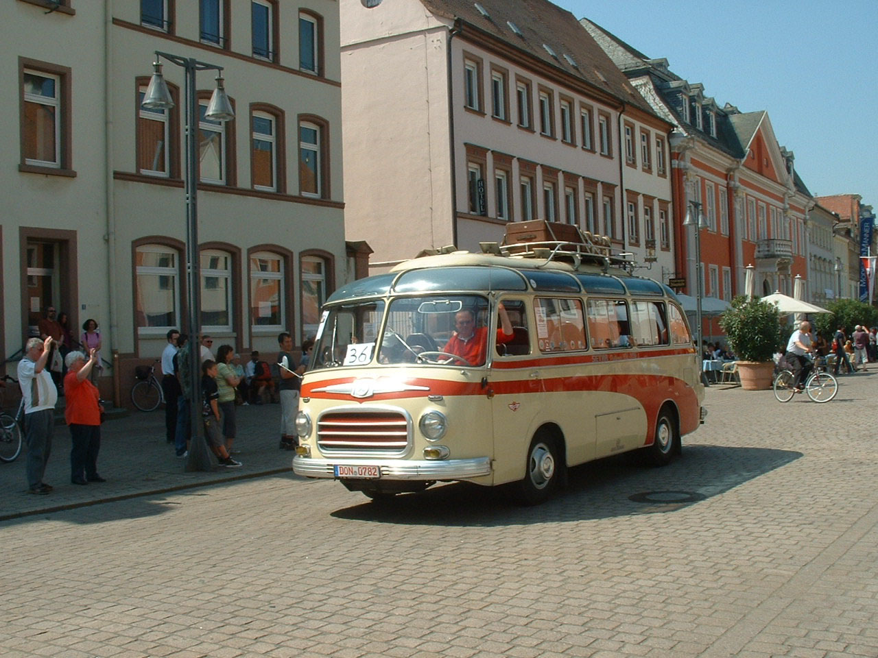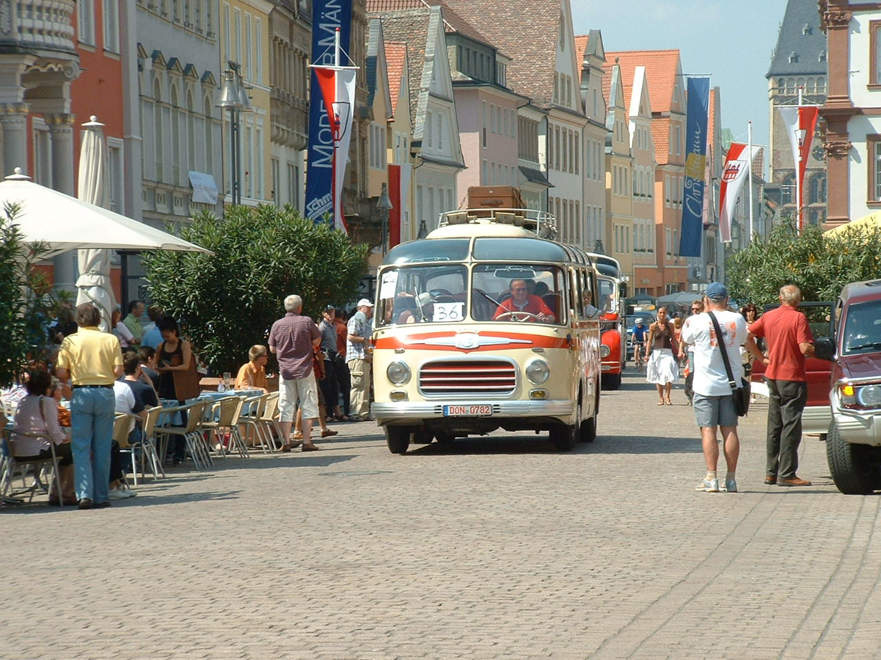 One of the ever popular Setra S6 preserved minicoaches passes the High Street cafes.