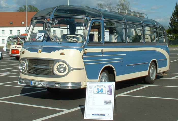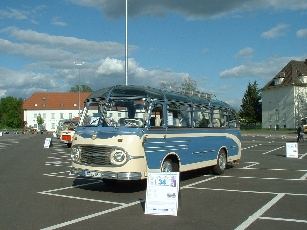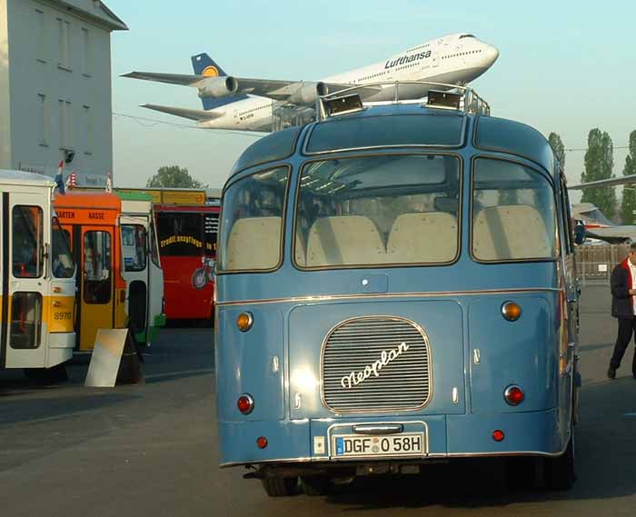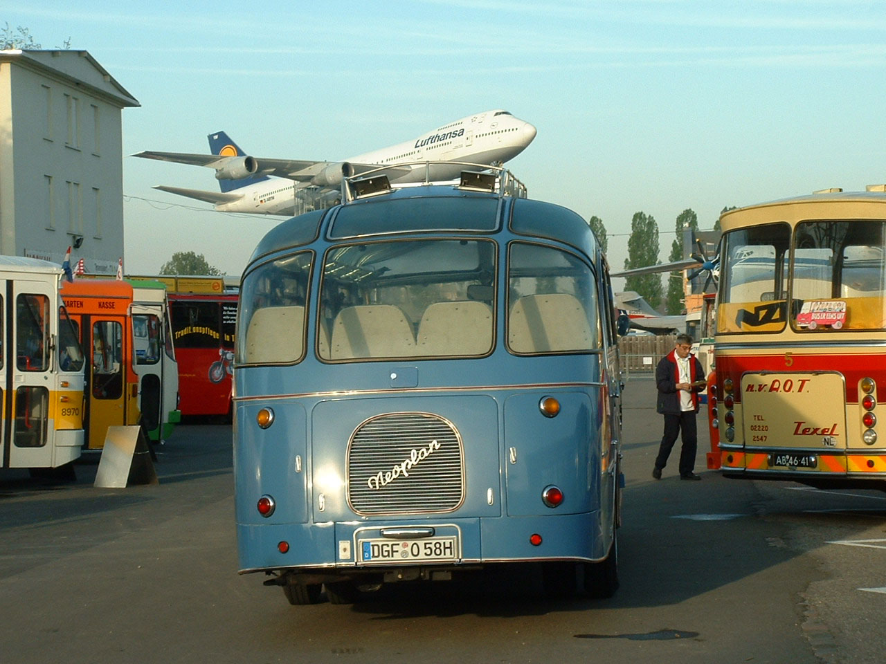 Konrad Auwaerter kindly invited the SHOWBUS team to the first Pan European Bus Rally to be staged at Speyer from April 22nd to 25th in 2004. We were able to attend for the last two days. The 100 vehicles were on display at the Technik Museum in Speyer in southern Germany. The Museum displays many of its aircraft in take off mode, like the Lufthansa 747 in the background. From Konrad's Auwaerter Museum near Stuttgart (under the Neoplan factory) is this NH6/7 of 1958, neatly hiding the gantry access to the jumbo. |