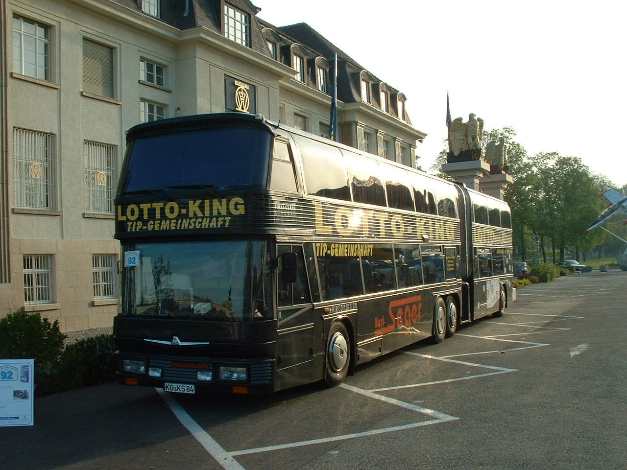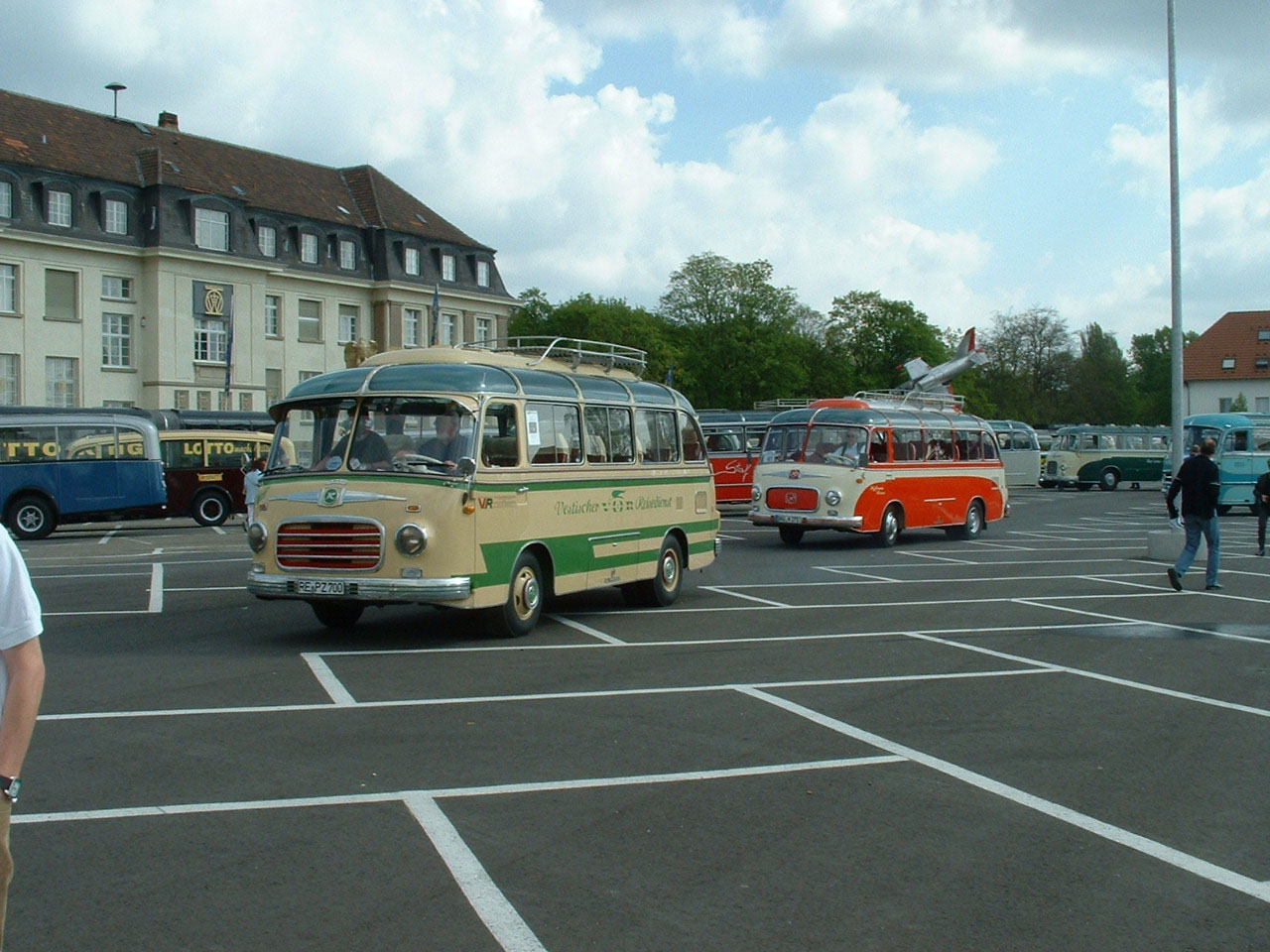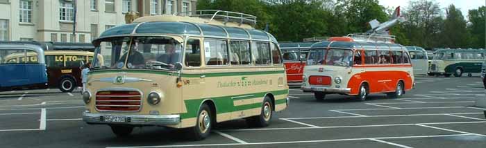 The rally display area fills up with vehicles returning from Sinsheim. The vintage FBW is in the foreground with the Saurer 3 C-H behind, but in the distance is a familiar site to British eyes: a Bristol Lodekka. The FLF originated with Wilts & Dorset. Its roof has been slightly lowered to the European maximum height of 4 metres. The bus had been modified for use by Kleins Raben Linie as one of several mobile hospitality units. |