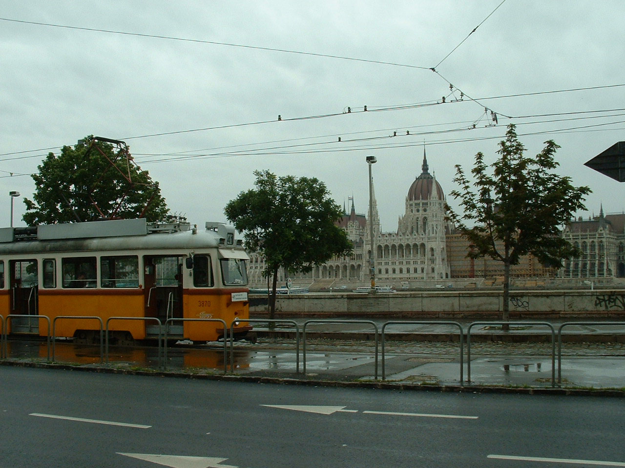 In 2006 the oldest trams in the Budapest BKV fleet were these Hungarian built UV cars by Ganz. UV stands for Uj Villamos, simply Hungarian for new tram. The Buda terminus of the 41 is attractively opposite the Parliament buildings. 3870 is seen at the terminus, it is one of the last batch built, the UV5 model, in the early sixties. |