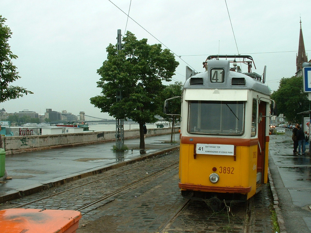 The oldest tram seen in June 2006 was 3240 dating from 1957 from the prototype UV1 batch of 50 cars. There were 375 UV cars in total - plus the trailer cars. Here 3240 is on route 19, which like route 41 dives into a U shaped tunnel at the Buda end of the Széchenyi Chain Bridge across the Danube. |