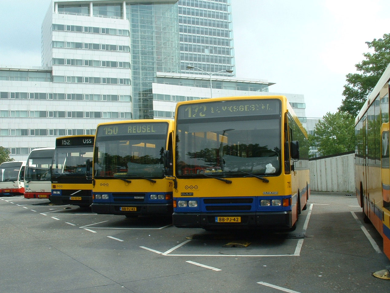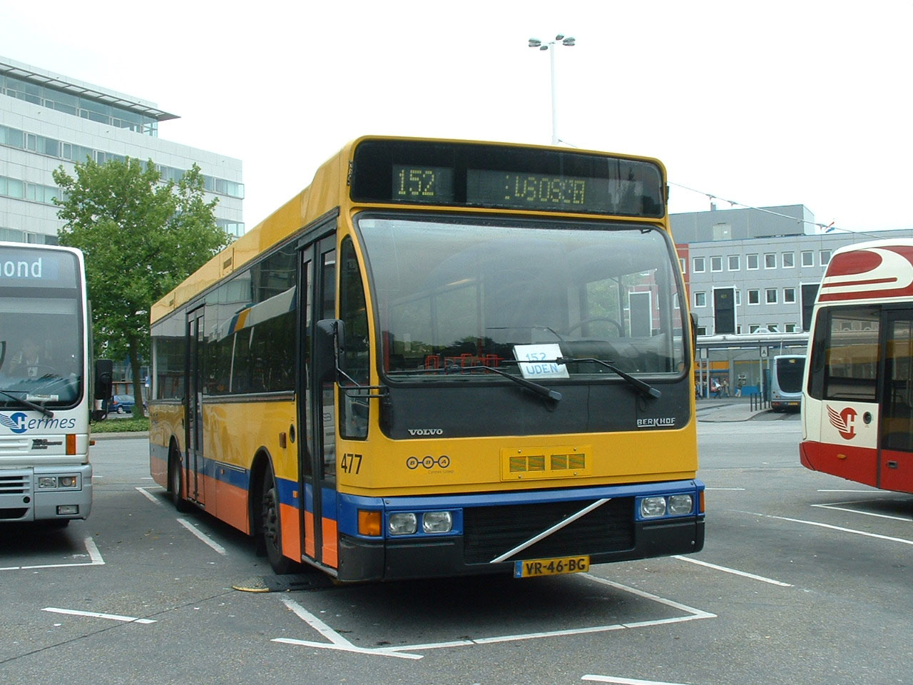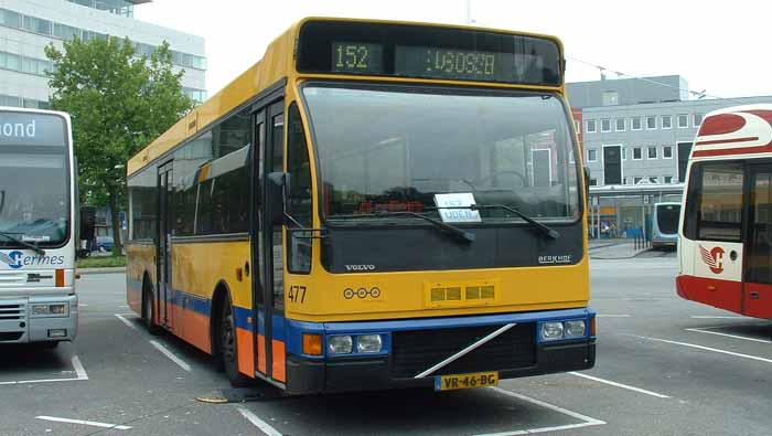 Many older members of the fleet in 2007 were still in the old yellow and blue colours, rather than the mor eclinical white and blue. This Berkhof bodied Volvo B10M, 477 (VR-46-BG) is seen on layover in Eindhoven Bus Station with a glimpse of the rear of one of Hermes' VDL Phileas on stand behind.