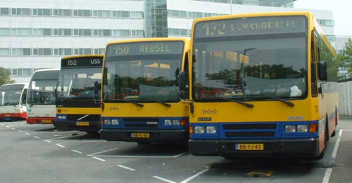 Another Volvo is seen with this consecutive pair of Berkhof bodied DAF SB220s, on the left 714 (BB-PJ-43) and on the right 713 (BB-PJ-42). The DAFs sport orange skirts on their livery.