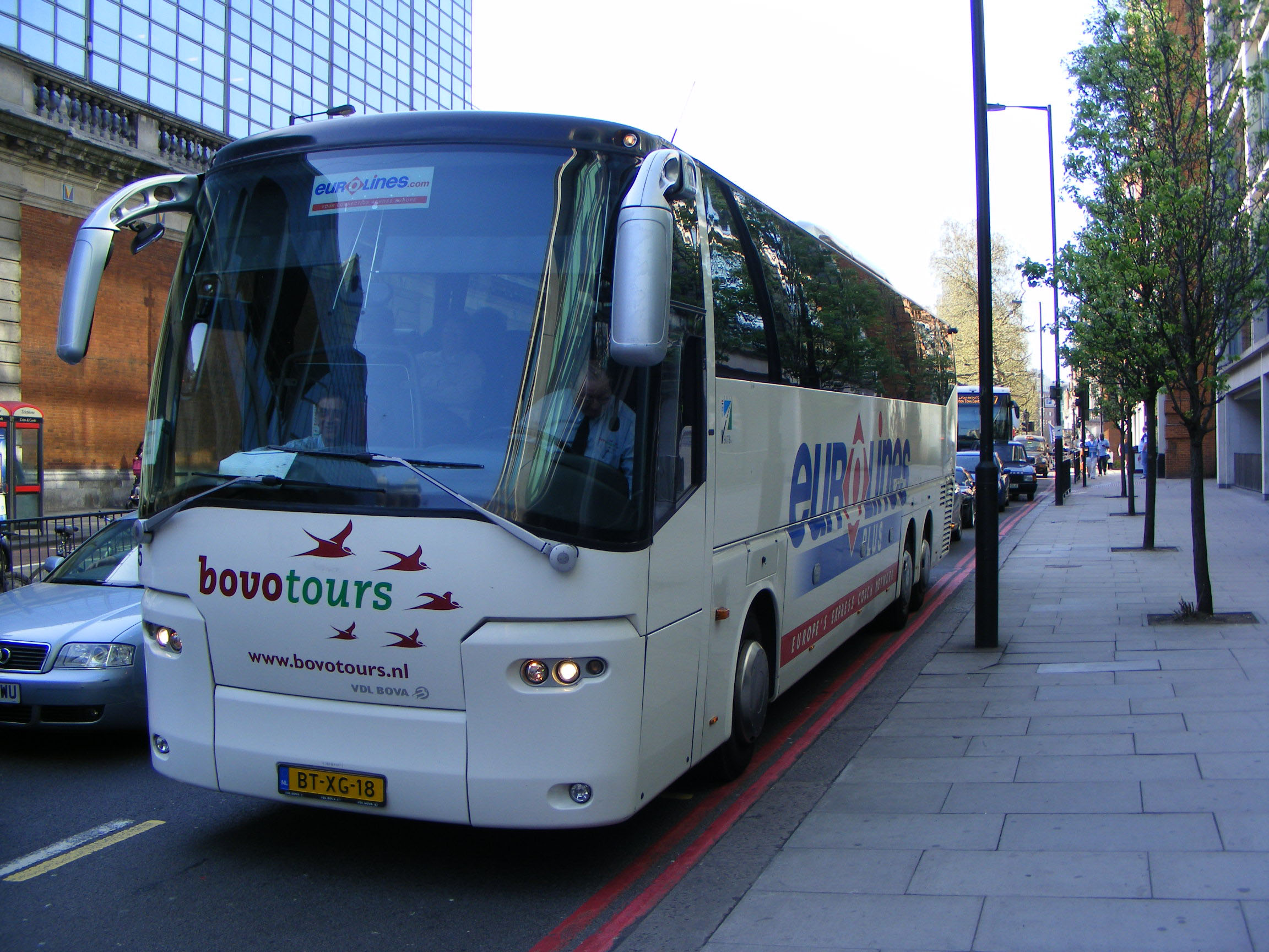 Bova Magiq 335 (BT-XG-18) is liveried for Eurolines and is seen on continental express duties around London Victoria in April 2011.