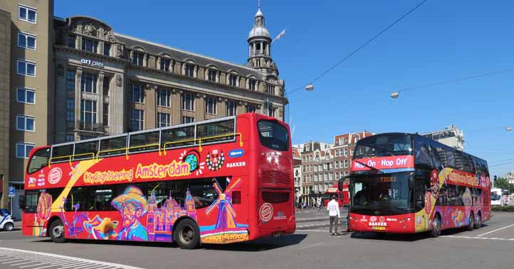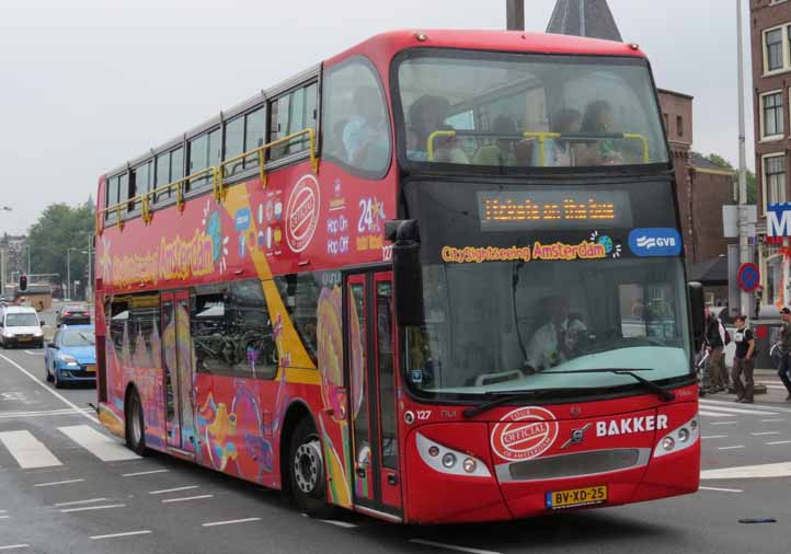 On what was a very good week weather-wise in Amsterdam in July 2014, the Monday weather was another when you did not want to be in an open topper as the rain set in late afternoon. At lunchtime Volvo/Unvi 127 (BV-XD-25) is seen on the city tour. Note the buses now have prominent Bakker and GVB branding. Quite what the working arrangement is is unknown.