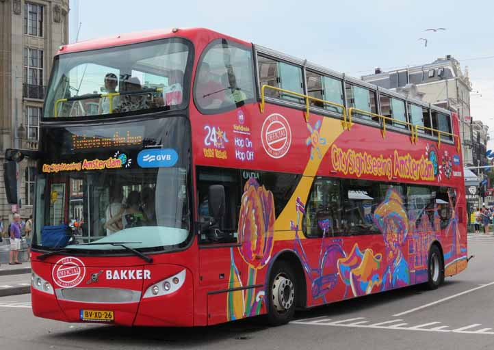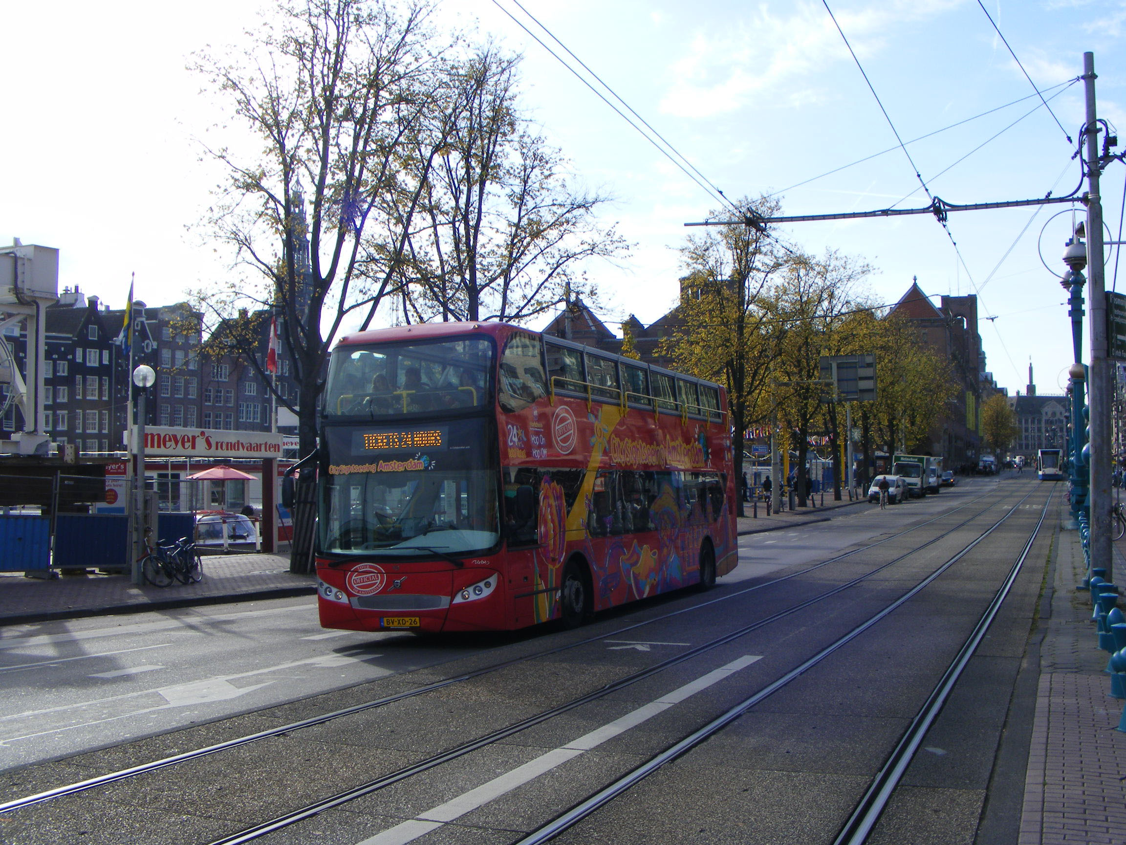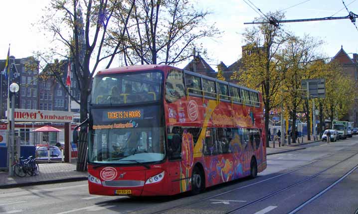 Amsterdam City Sightseeing shares the same problem as Melbourne - namely lots of overhead tram wires. The buses used can therefore not be completely open topped to prevent passengers reaching up and electrocuting themselves! This Unvi Alibi, BV-XD-26, bodied Volvo B9TL B9TL is seen on a day when an open topper might not be the best option anyway in October 2009.