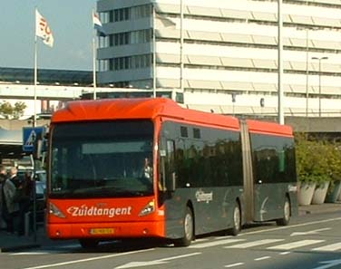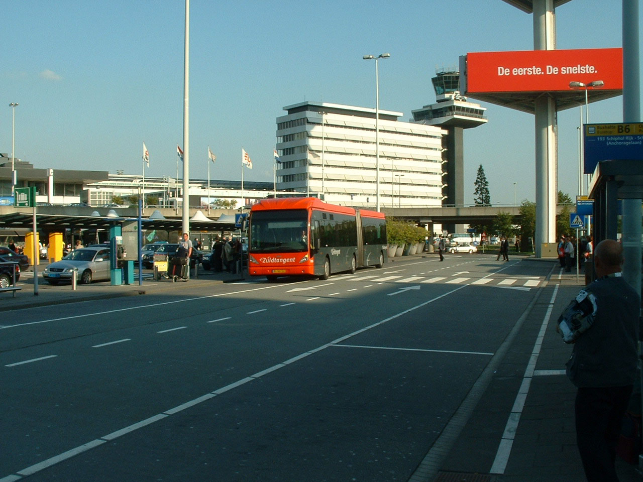 A Zuidtangent arrives at Schiphol in Autumn 2004. The service was first mooted by HTM as a light rail project, but it was feared the track would not be ready in time for the Floriade flower festival which took place along the route in 2002. The dedicated busway has been carefully designed so it meets all light rail standards so a conversion to light rail at some future date is an option. Plans were for Zuidtangent to extend to the south-east tip of Ijburg in 2008 which could then justify the rail upgrade. This did not happen.