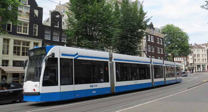 Heading for Centraal station along tree lined route 17 from Flevopark in July 2014 is Combino 2021.
