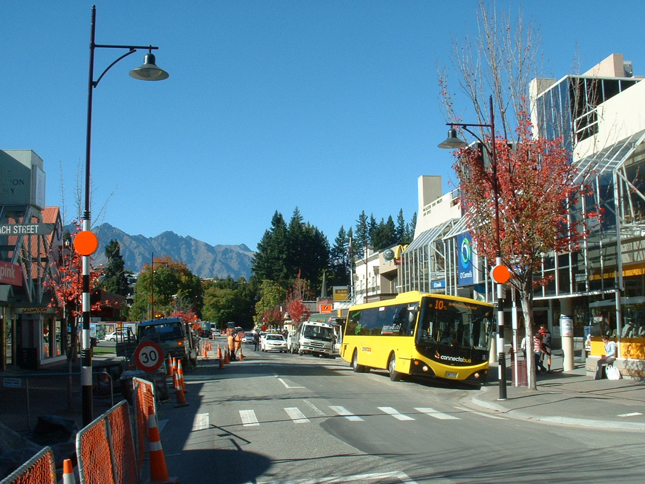 The bus again at the main terminus in Queenstown, with its magnificent mountain back drops.