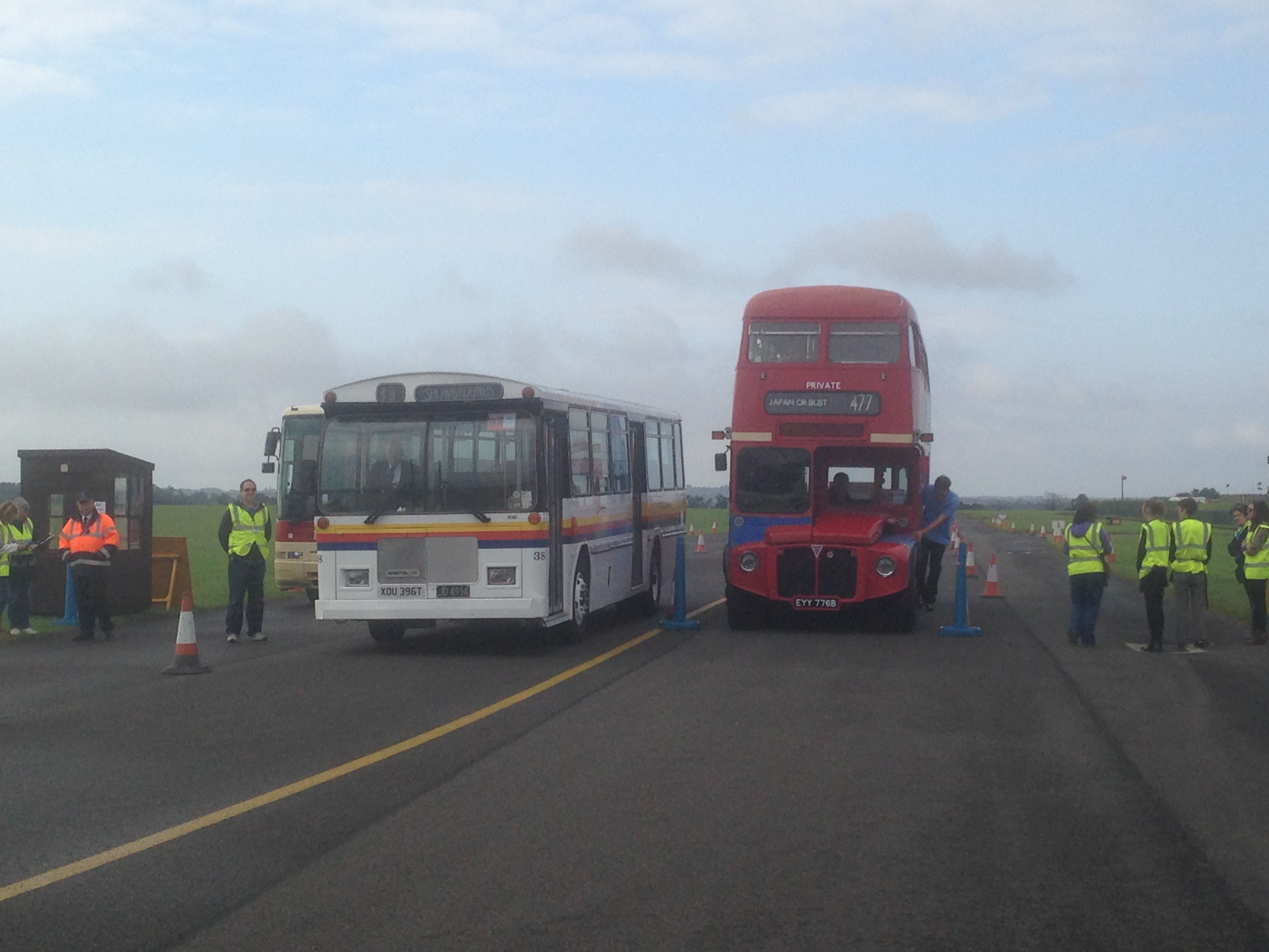The Bayline RE arrived with former Northern General AEC-Park Royal RMF Routemaster 2101 (RCN701) disguised as RMF2771 (EYY766B). The group owning the bus were attempting to raise funds to travel across Europe and Asia to Japan.