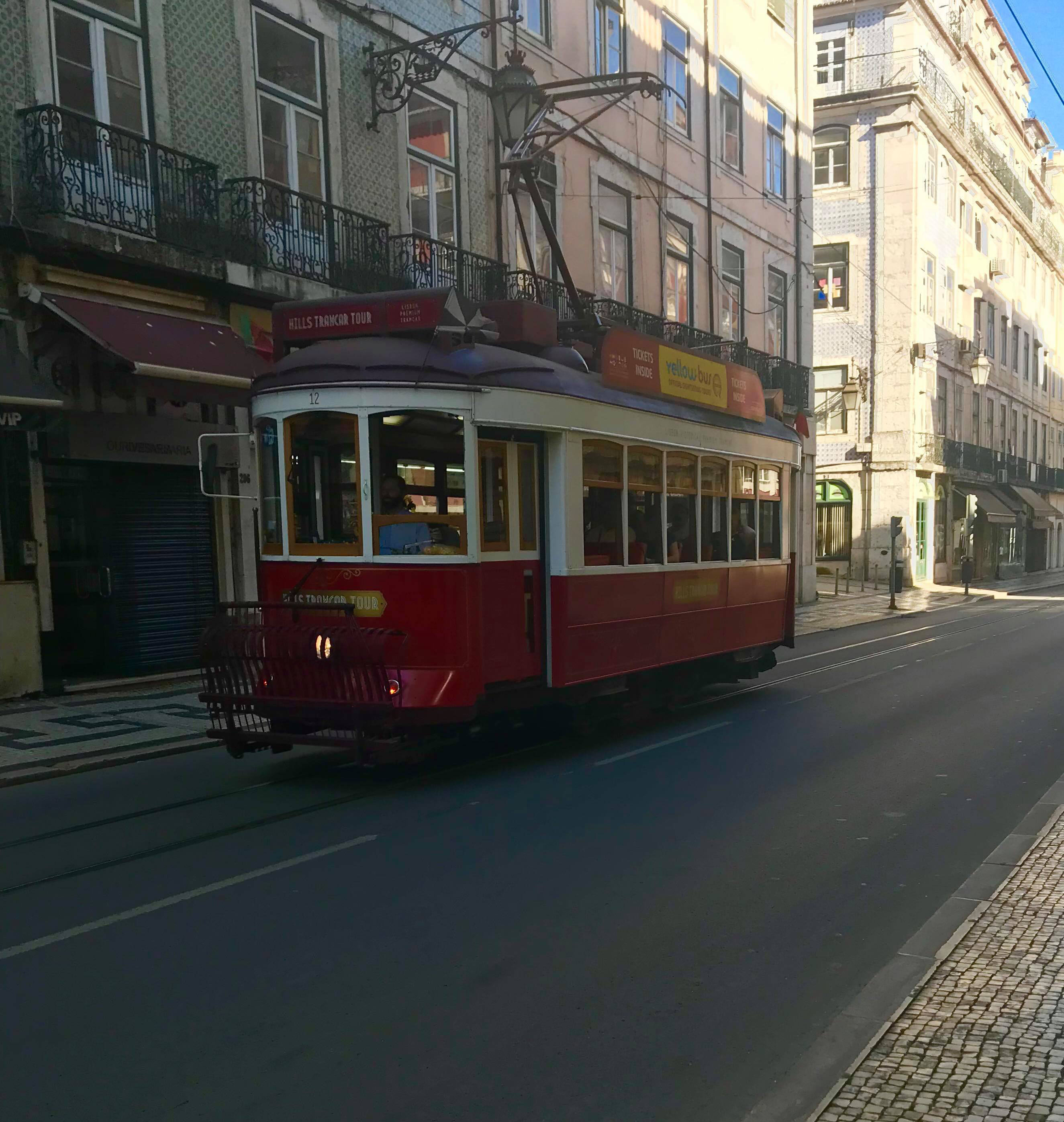 Contrasting red and yellow vintage trams in the impressive Praca do Comércio. |